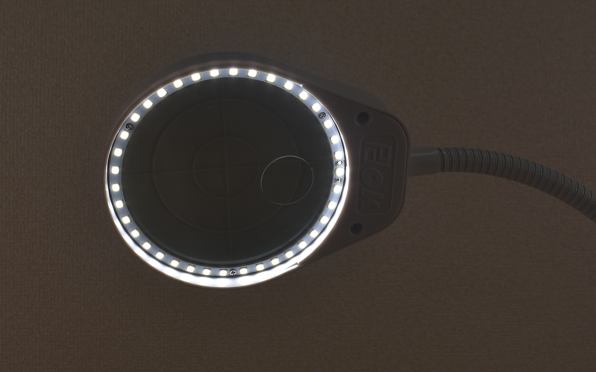 ライトはダイヤルを回して無段階で調整可能でした。覗いてみるとLEDが38個もついており、暗いところでも文字が読めるくらいの明るさになります。電気が点いている部屋で補助ライトとして使用するのも視認性が高まるのでオススメ。無段階調光なので、部屋の明るさに合わせて明度の調節ができるのはGOODです。