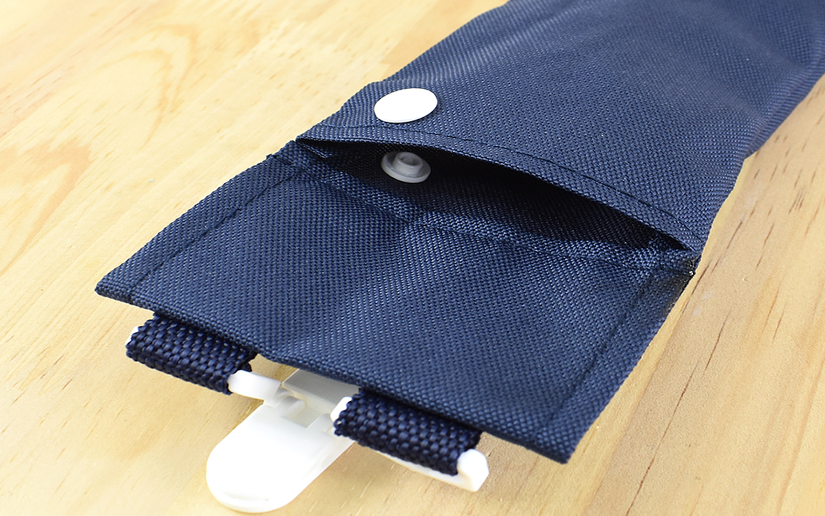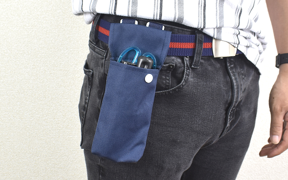 まず試してみたのはウエストポーチの仕様。ギザギザのフックが付いていたのでベルトに噛み合わせてぶら下げてみました。サイズが90(上部幅/下部幅70)×200mm(高さ/ポケット140mm)とスリムなため、それほどモノが入れられるというわけではありません。ハサミやドライバーを入れるのにはピッタリなサイズ感でした。