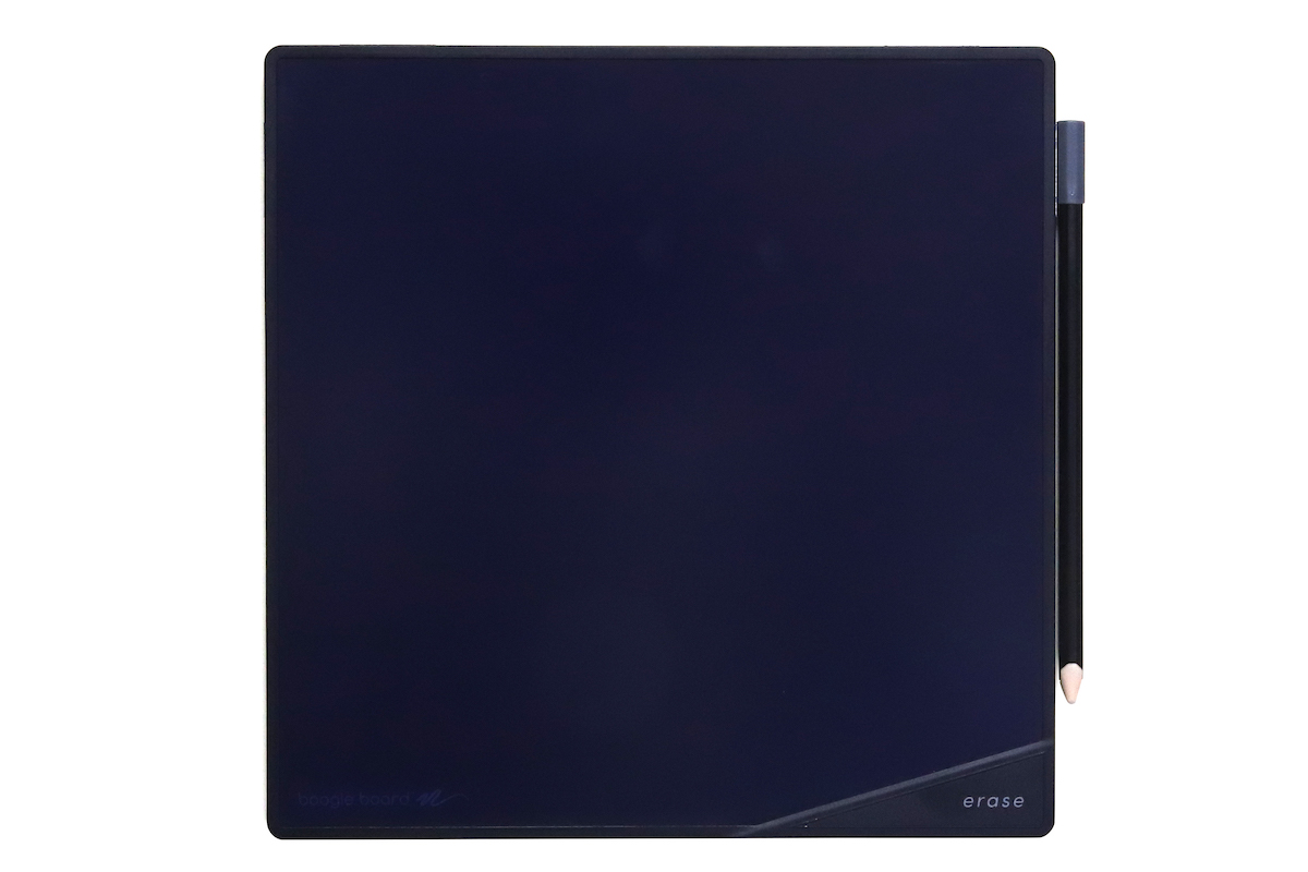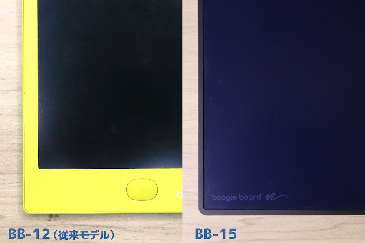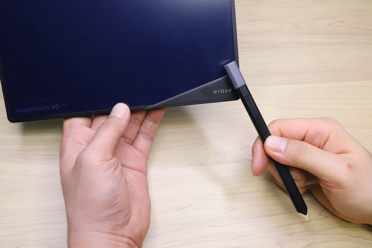 ブギーボードは、「スタイラスなどで画面を加圧すると筆跡が残せて、消去ボタンを押すと画面が消えてリセットされる」というのが基本の仕組みだ。となれば消去ボタンは必須なのだが、BB-15はボタンの代わりに消去ポイントを画面右下に設置。ここに専用スタイラスの上部(マグネット内蔵)を近づけることで、画面がリセットできるようになっている。