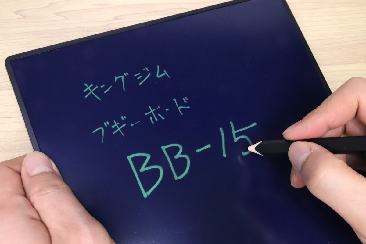 そうしてたどり着いたのが、キングジムの「ブギーボード BB-15」(以下BB-15)だ。液晶に加圧して筆記する“電子メモパッド”というジャンルなので、正確にはホワイトボードではないが、用途はまったく同じだ。なにより見た目に事務用品っぽさがなく、かなりスタイリッシュ。