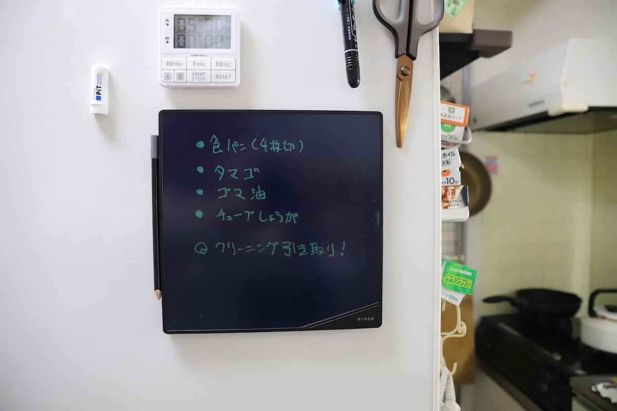 最近いろいろと試しているのが「家庭向けのホワイトボード」。というのも、我が家は夫婦ともにフリーランスで日中はほぼ在宅。常に顔を合わせているので、例えば「ティッシュのストックがもうないから、外に出たときに買ってきて」なんて連絡も口頭で済ませるんだけど……だいたい忘れちゃうのだ。そしてたいてい、言った言わないでモメる。
