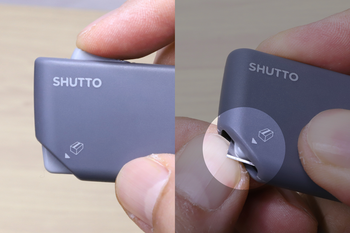 使う際はまず本体を挟むように持って、人差し指で上部のボタンを押し込む。すると安全ロックが解除されるので、そのまま本体下カドをテープに押し込むと、刃ガードがスライドして金属刃が露出する仕組み。