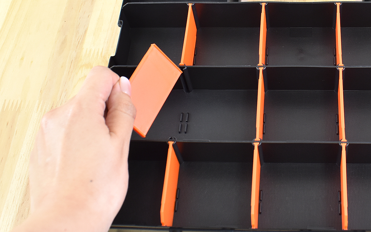 黒の仕切りは固定ですが、オレンジの仕切板は取り外しが可能でした。パーツの量によって自由に収納スペースを調整できるだけでなく、ちょっとした細長いパーツも収納できます。