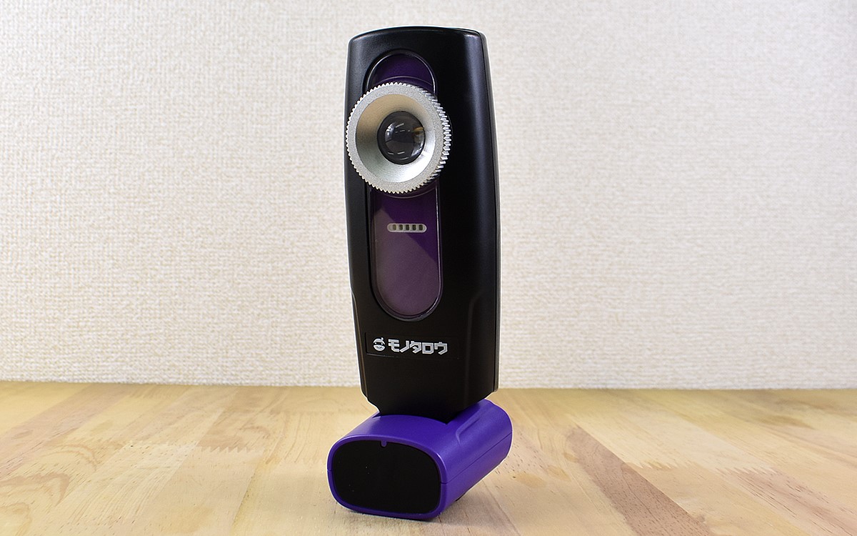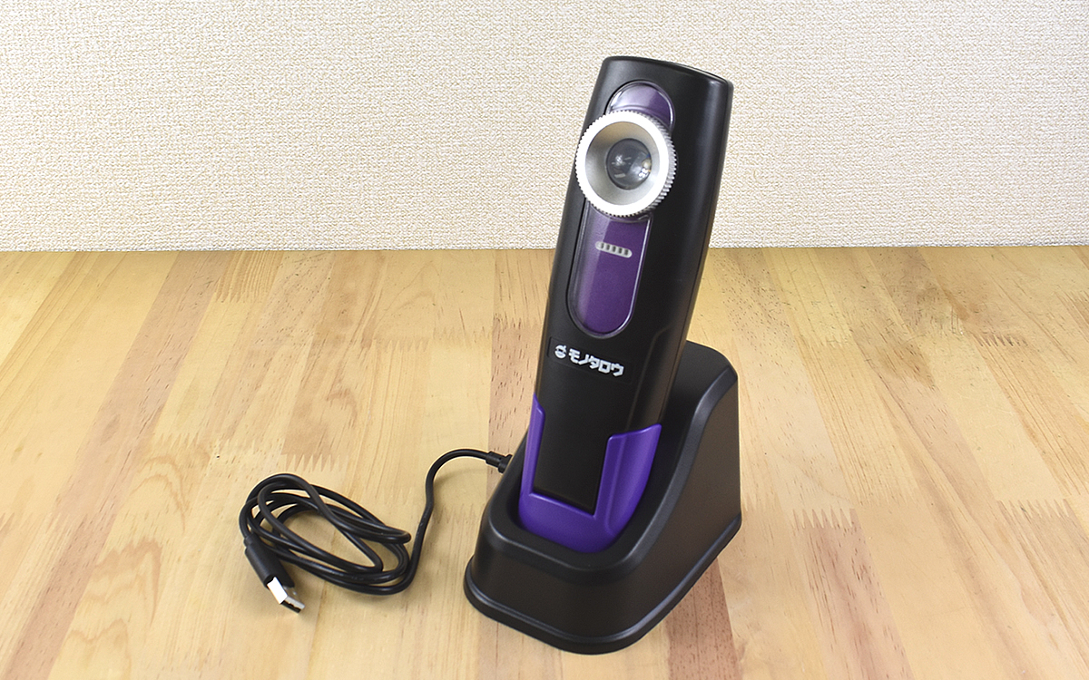 本体の大きさは190(高さ)×56(幅)×36mm(奥行)ほどと、片手で持てるサイズ。頑丈な作りで、手に持つとしっかりとした重さを感じました。同商品は充電台とUSBケーブルがセットになっていて、ノートPCなどからも充電が可能。乾電池を入れ替える手間がないのはラクで良いですね。
