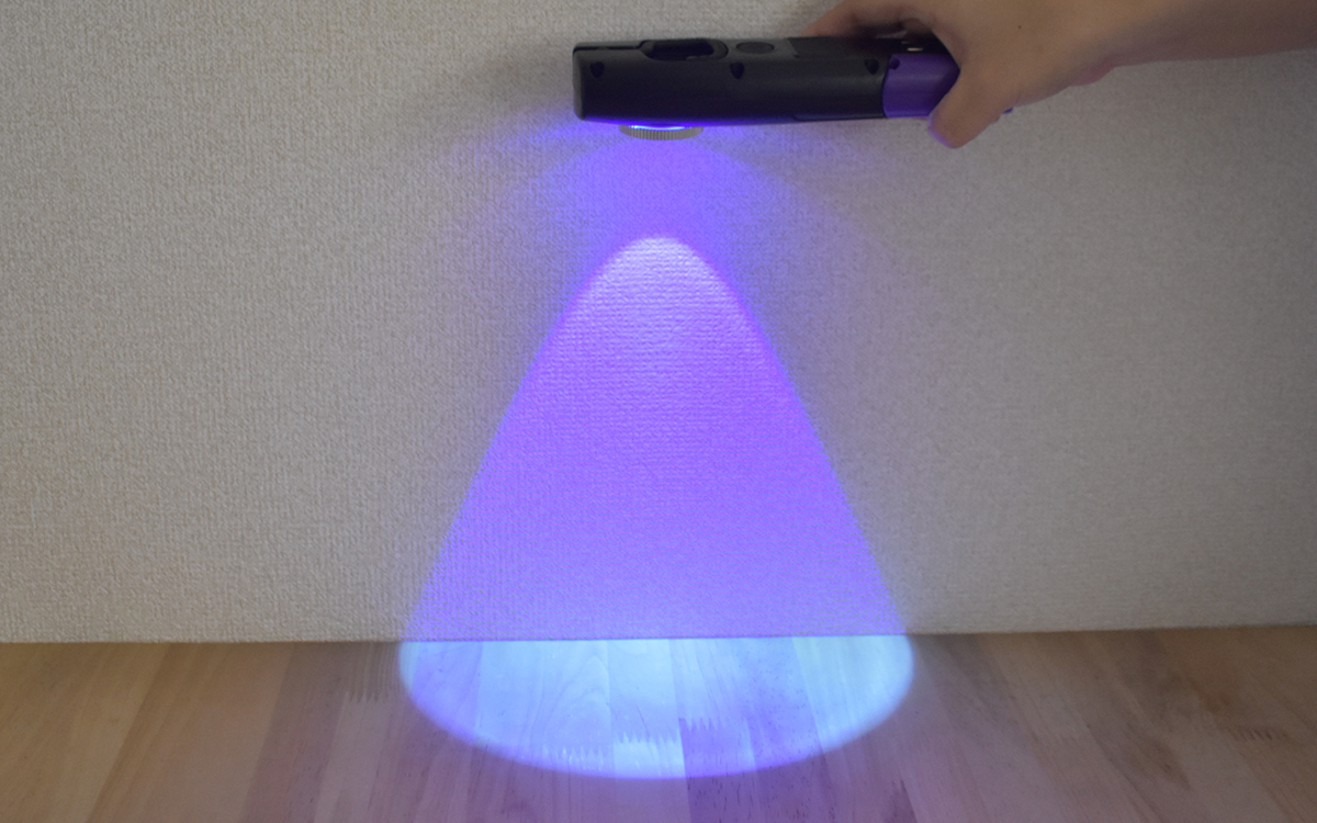 本体背面の電源ボタンを押して実際に紫外線ライトを点けてみたところ、光はかなりの強さ。明るい場所で使用しても、照らされた範囲の傷跡がしっかり確認できるほどのハイパワーです。
