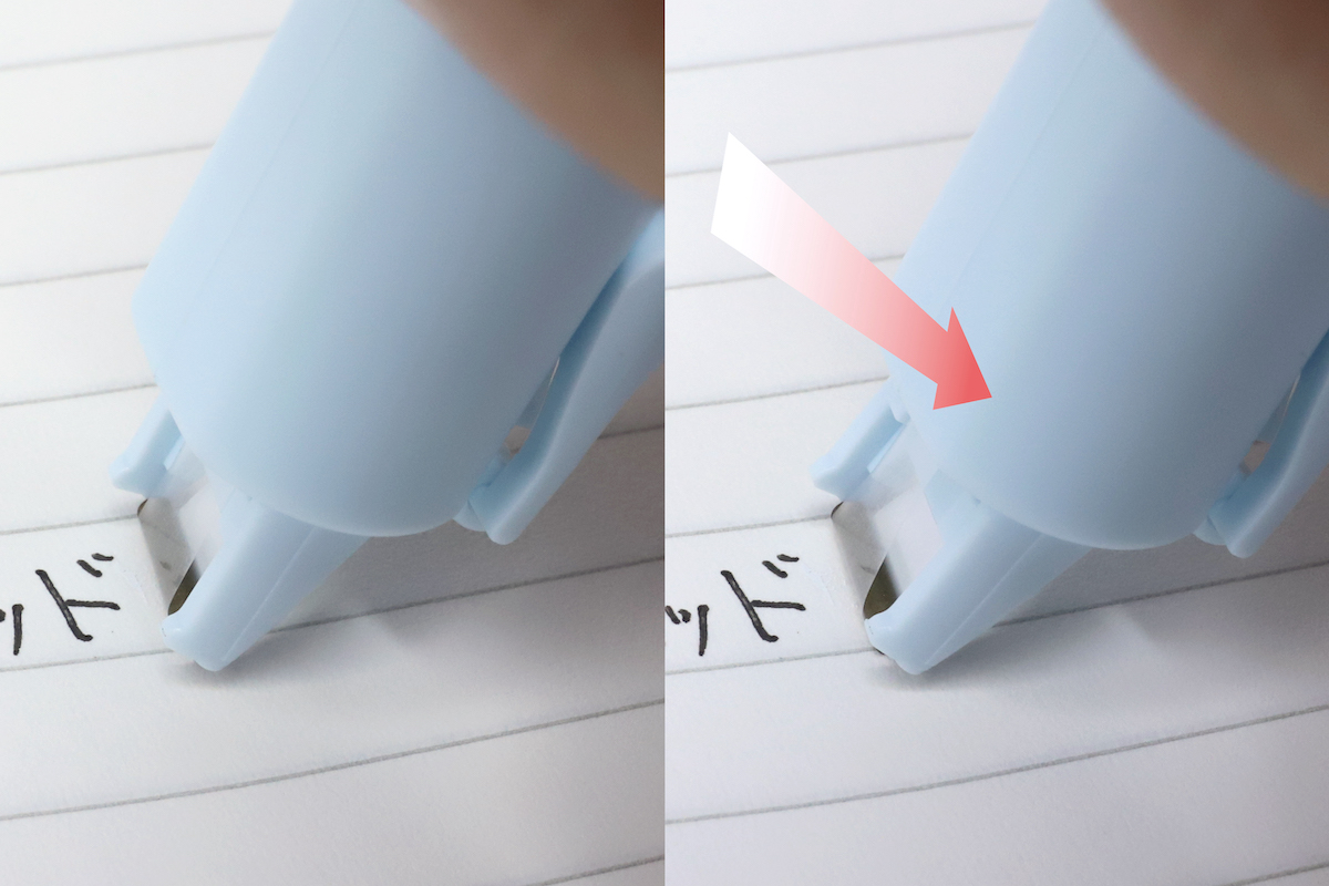 ペン先にはクッションヘッド機構を備え、筆圧をかけると適度に上下(+わずかに左右ロール)にしなる構造となっている。これがサスペンションとなって、ヘッドの紙への密着度がアップ。テープがガタつくことなく、ぴったりと修正できるという仕組みだ。