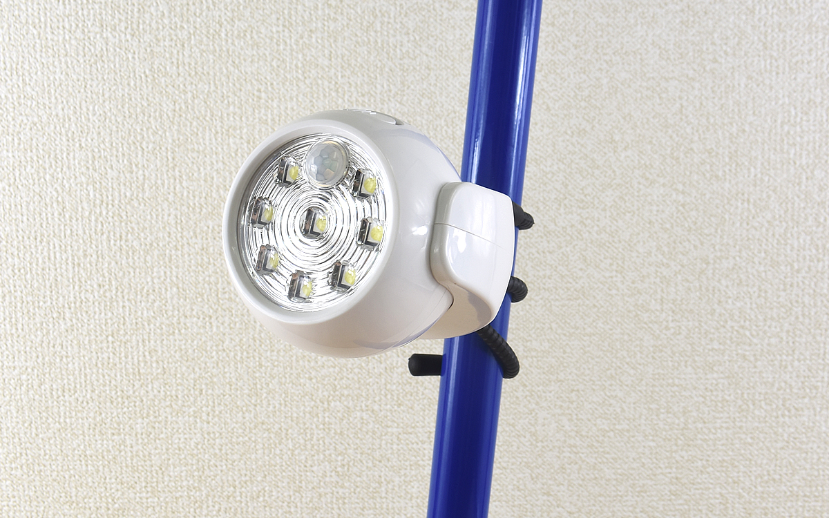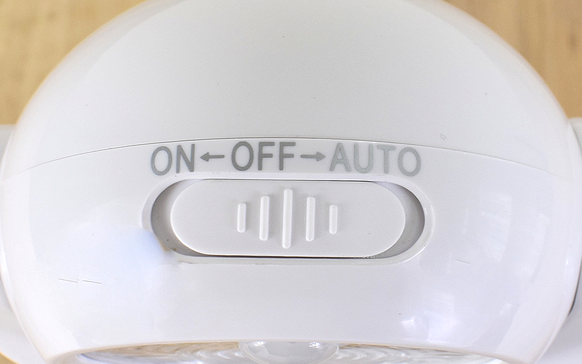 ライト機能はスイッチをONにして通常どおり点灯するパターンと、スイッチをAUTOにして人感センサーで点灯する2パターンがあります。センサーの感度がかなり良く、しっかり電池を入れておけばストレスなく使えそう。ライトを覗いてみるとLEDが8灯もついており、玄関や階段のちょっとした照明としては申し分ないほどの明るさでした。