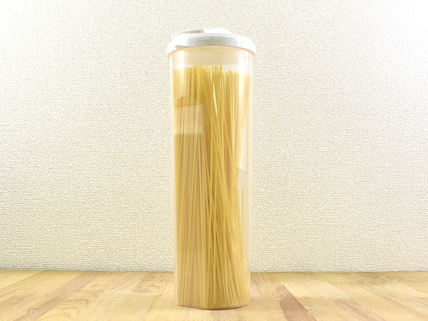 「パスタストッカー」の大きさは、およそ10(幅)×10(奥行)×29.5cm(高さ)。スーパーなどでよく見かける袋に入ったスパゲティが25cmほどなので、ちょうどよいサイズ感です。パッケージの記載によると保存容量は約1.2kg。300g入りの商品が一度に4袋保存できることになります。