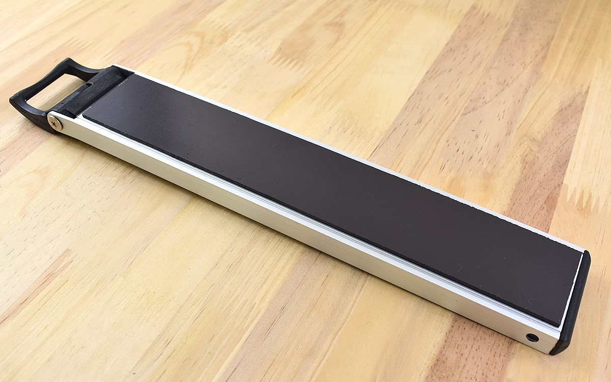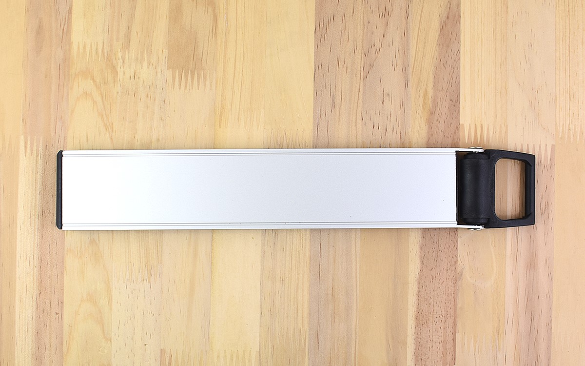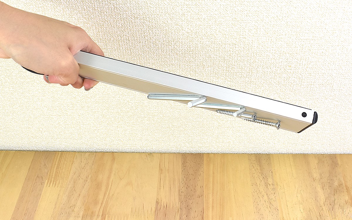 サイズは約50(高さ)×300(幅)×14mm(厚さ)で、実際に持ってみると見た目より意外と重くしっかりとした作りの同商品。本体背面には金属面に装着できるマグネットが貼られています。ハンガーと聞くとぶら下げ型をイメージしますが、このアイテムは磁石でツールキャビネットなどに取り付けが可能。実際に金属面に設置したところ、一気に引っぱられて「バチン!」と音を立てる勢いでくっつくほど磁力抜群でした。