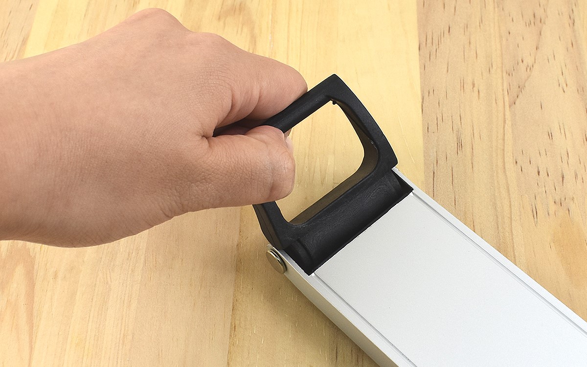 片側の端についているレバーは、ハンガーを外すときに活躍します。レバーを使わずに手の力で外そうとしてもビクともせず、かなりパワーを入れて外せるかどうかのレベル。レバーを引っ張る時も力が要るので、それだけガッチリと固定できている証拠で心強いですね。