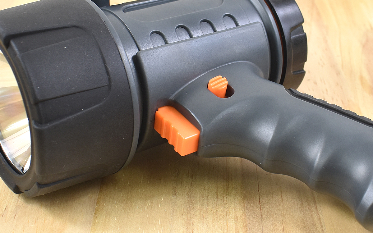 グリップは握りやすく、引き金の位置にあるスイッチも人差し指で簡単に操作可能。スイッチの脇にはロック機能が付いており、誤動作を防いでくれます。いつの間にかスイッチがONになっていて保管中に電池切れといった事態も予防できますね。