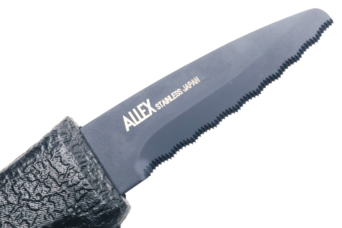 グリップから伸びた刃は刃渡り約45mm。やや荒めのトゲトゲしたギザ刃だが、さらにそのギザ刃自体が全体的にギザギザと波打つWギザ刃仕様なのが、最大の特徴だ。フッ素コートされた黒さもあって、やや禍々しい(まがまがしい)というか、“中二マインド”をくすぐる格好良さである。