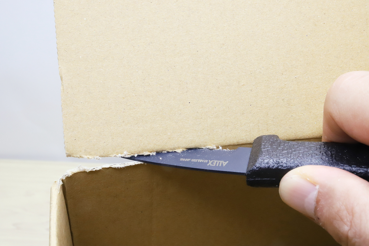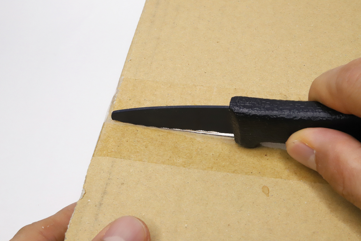 開梱に使うときのコツは、刃を水平に近いところまで寝かせてテープに当てること。あとはそのまま角度を変えずに最後まで引けば、テープはきれいに切ることができる。もちろん、この切り方なら中身へのダメージもまず心配無用。