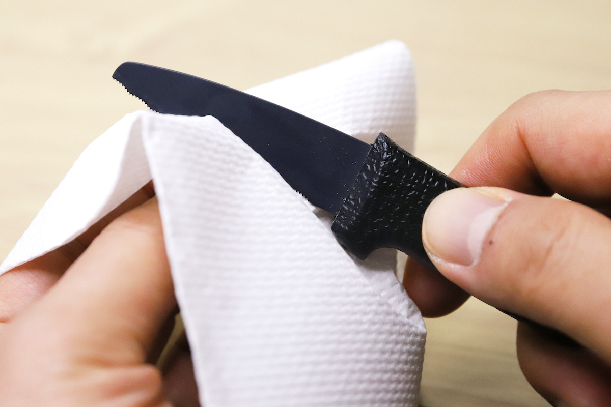 ただ、思ったよりも刃の目に紙粉が詰まりやすい傾向もあるように感じた。紙粉が詰まると当然切れ味も落ちるので、小まめに取り除くのがいいだろう。キッチンペーパーで目に沿って何度か拭ってやれば、詰まりは解消できるはずだ。(ギザ刃とはいえ怪我には注意)