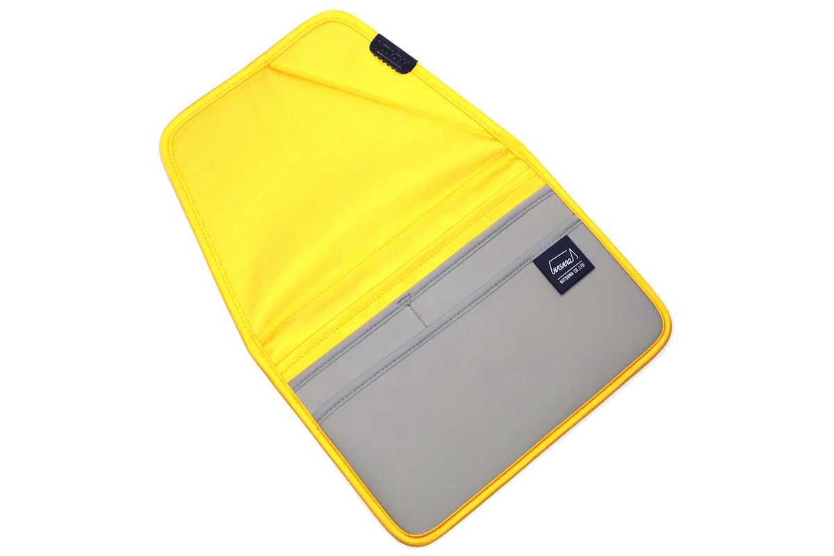 「ハサンドスタンド」は、ポケット群とフラップに分かれた二つ折り構造。ここにリュック荷室の仕切りを挟みこむことで、小物を沈ませることなく収納できるポケットを増設できるのだ。