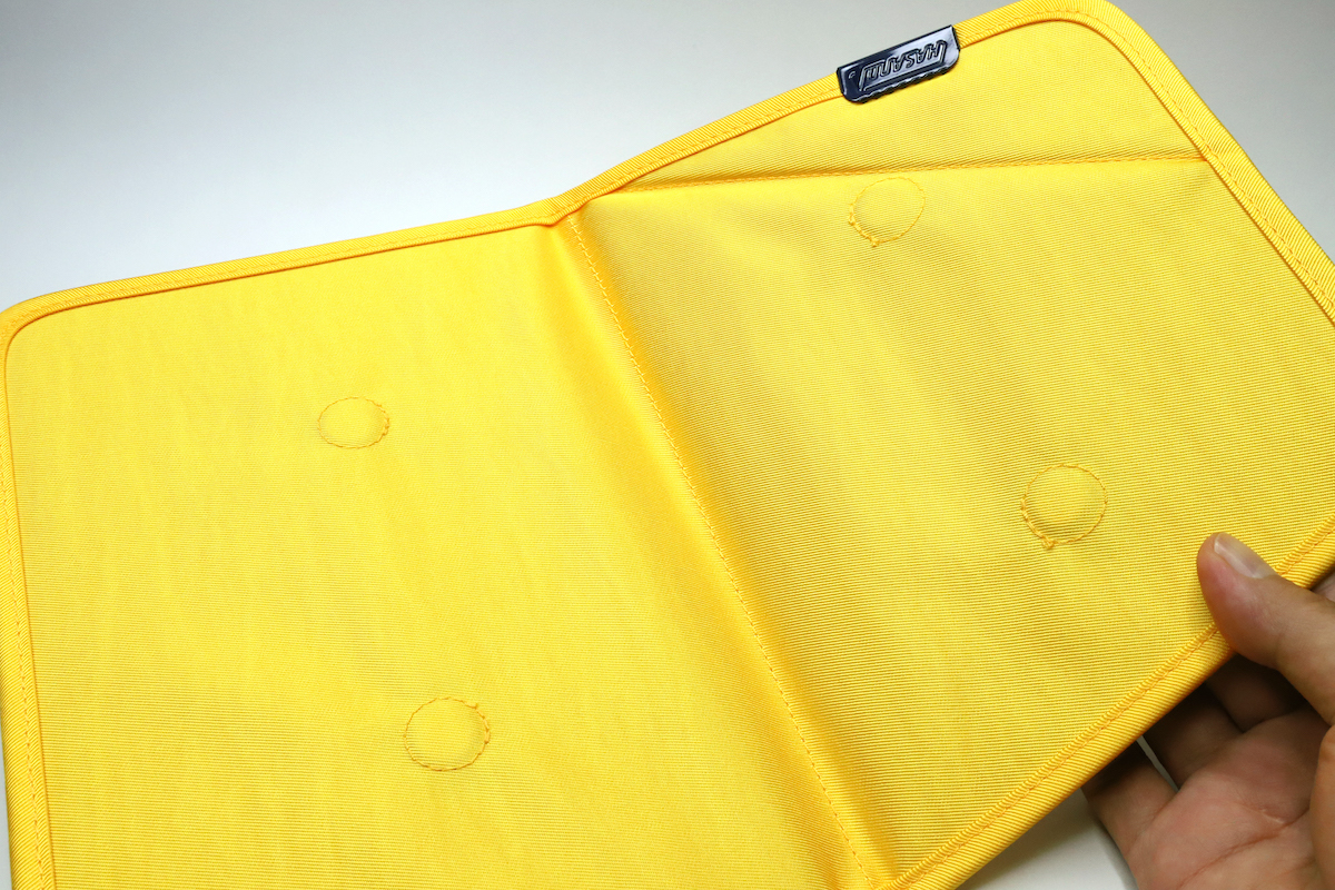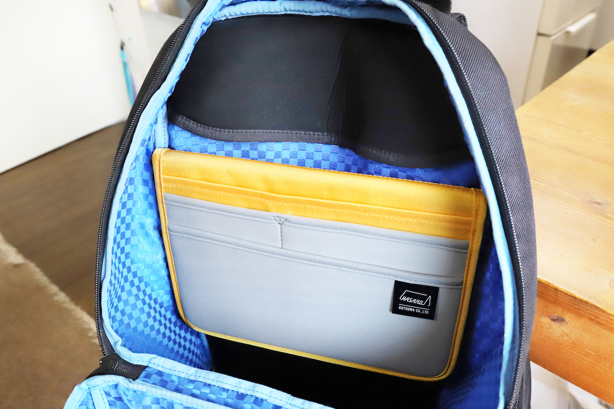 3段のポケットにはマチがないが、手前2段はウェットスーツにも使われる伸縮性の高い生地なので、多少の厚物は収納が可能だ。奥は外装と同じ硬めのポリエステル生地で、A5サイズのノートや手帳がちょうど収まる感じである。