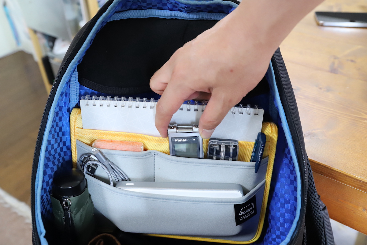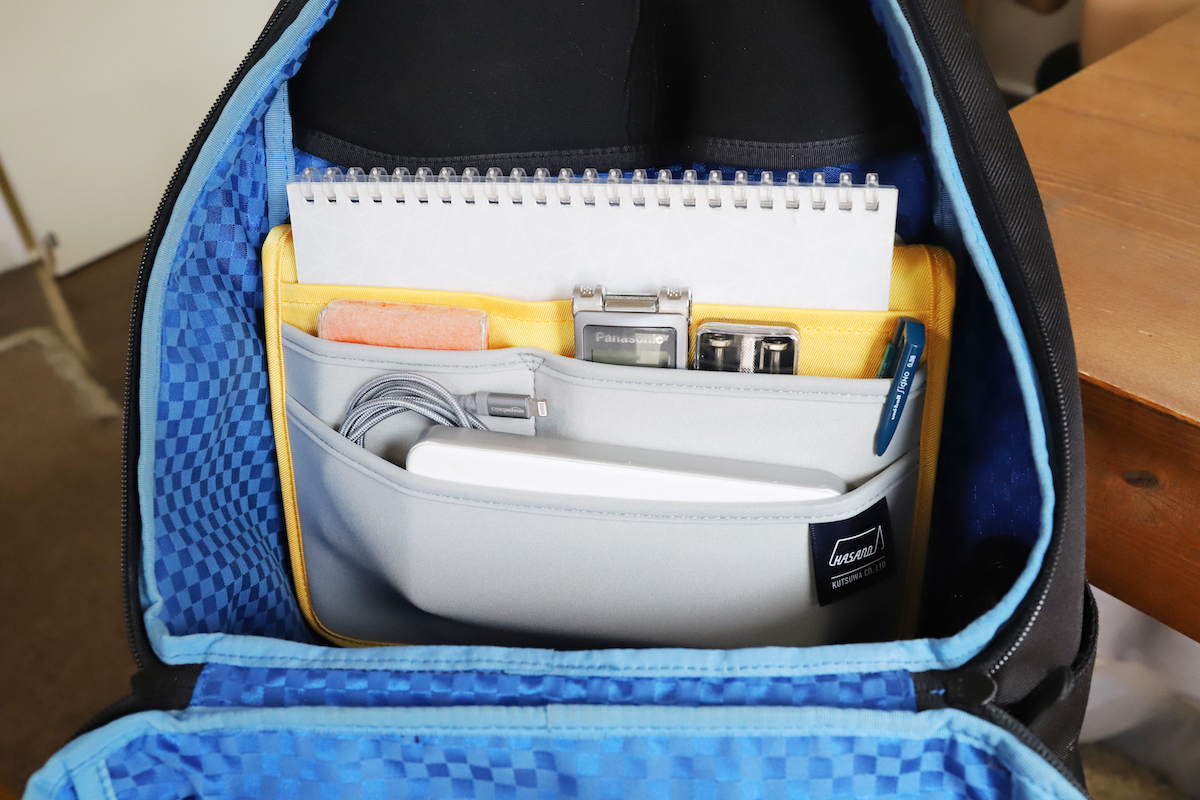 とはいえ、外出先で仕事をすることも多いため、ノートPCやガジェット類、ペンケース、ノートその他もろもろとリュックに詰め込みがちなのだが、中が整理されていないため、何かを取り出そうとするたびにゴソゴソと引っかき回すことになる。これは面倒くさいし、誰かに見られると恥ずかしい。