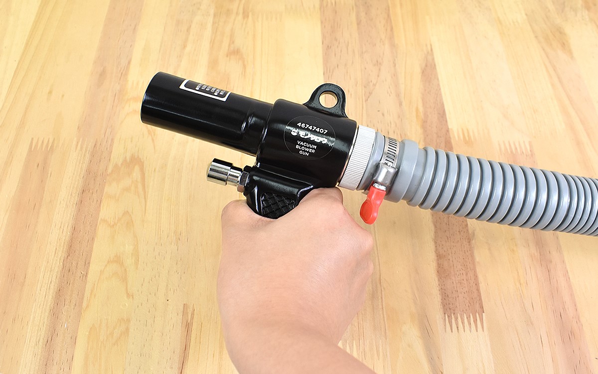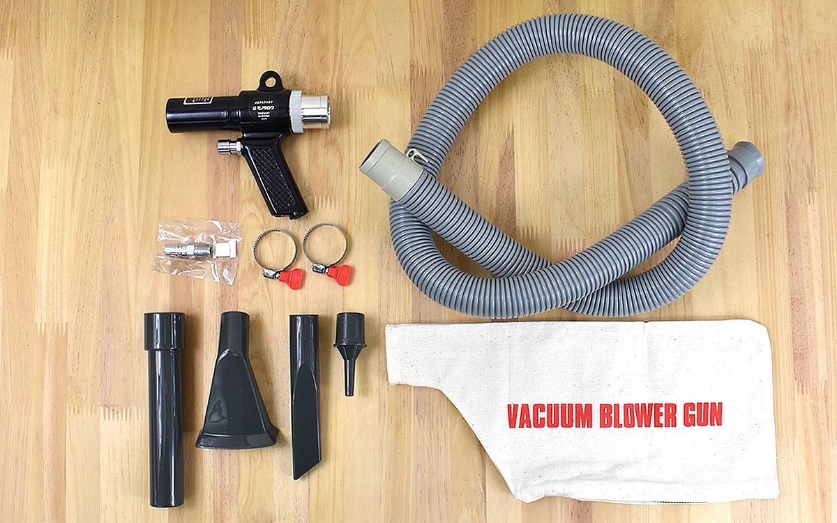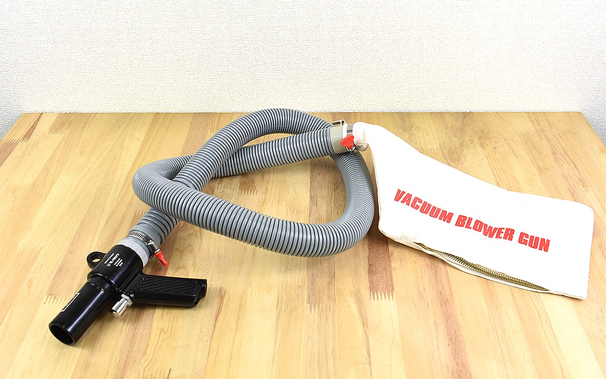 ガンタイプの本体と固定用バンド2本、サクションホース、ダストバッグ、ブラシノズル、ノズル用延長パイプ、ストレートノズル、細口ノズル、カプラプラグがセットになった同商品。空圧工具のため単体では動作せず、別売りのエアコンプレッサーと接続して使用します。