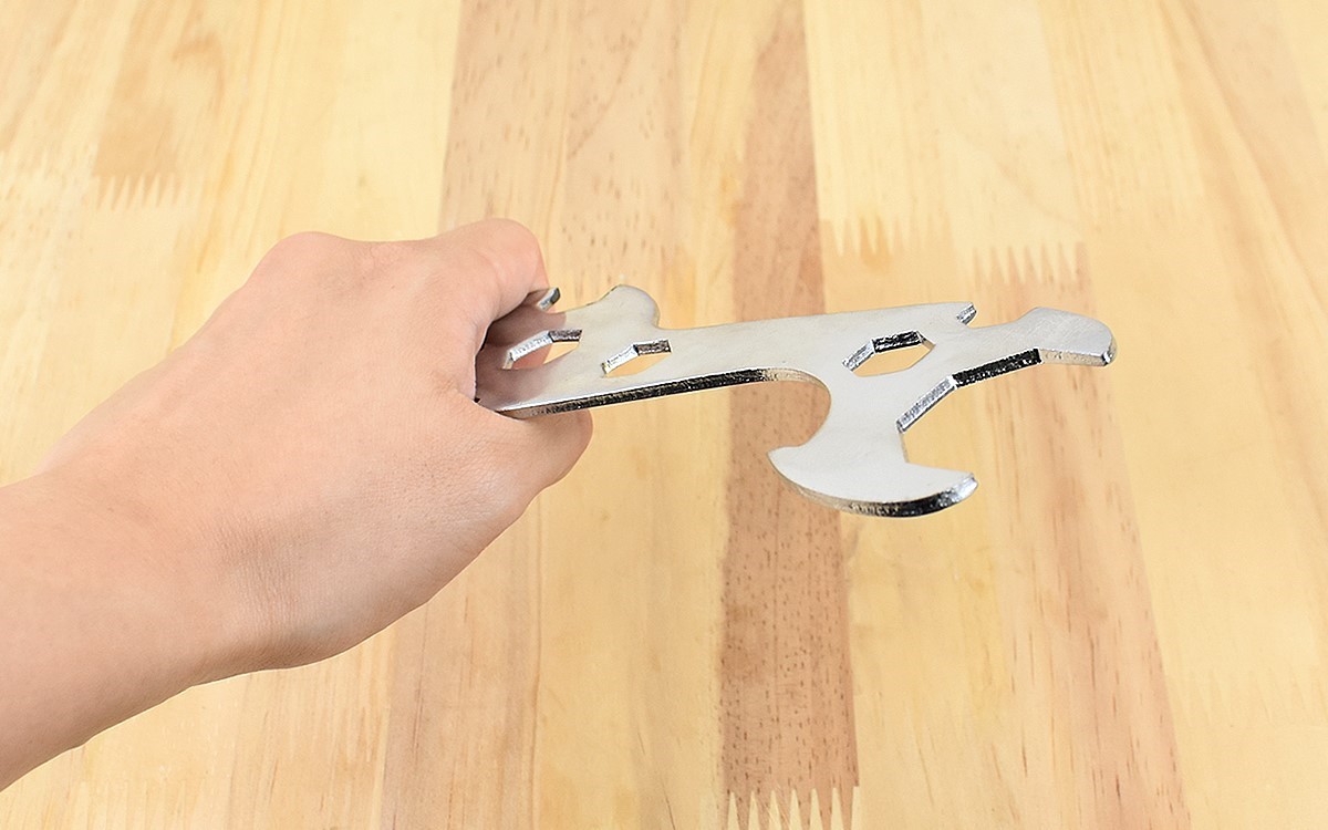 1つで10mm、11mm、12mm、13mm、14mm、15mm、22mm、32mmの8つのサイズに対応する同商品。全長は14.5cmとコンパクトで持ち歩く際に邪魔にならないサイズ感です。素材は炭素工具鋼に焼き入れ処理、クロームメッキ仕上げという本格仕様。クロームメッキは硬度の高さに加えて耐摩耗性にも優れているため長く使えそう。
