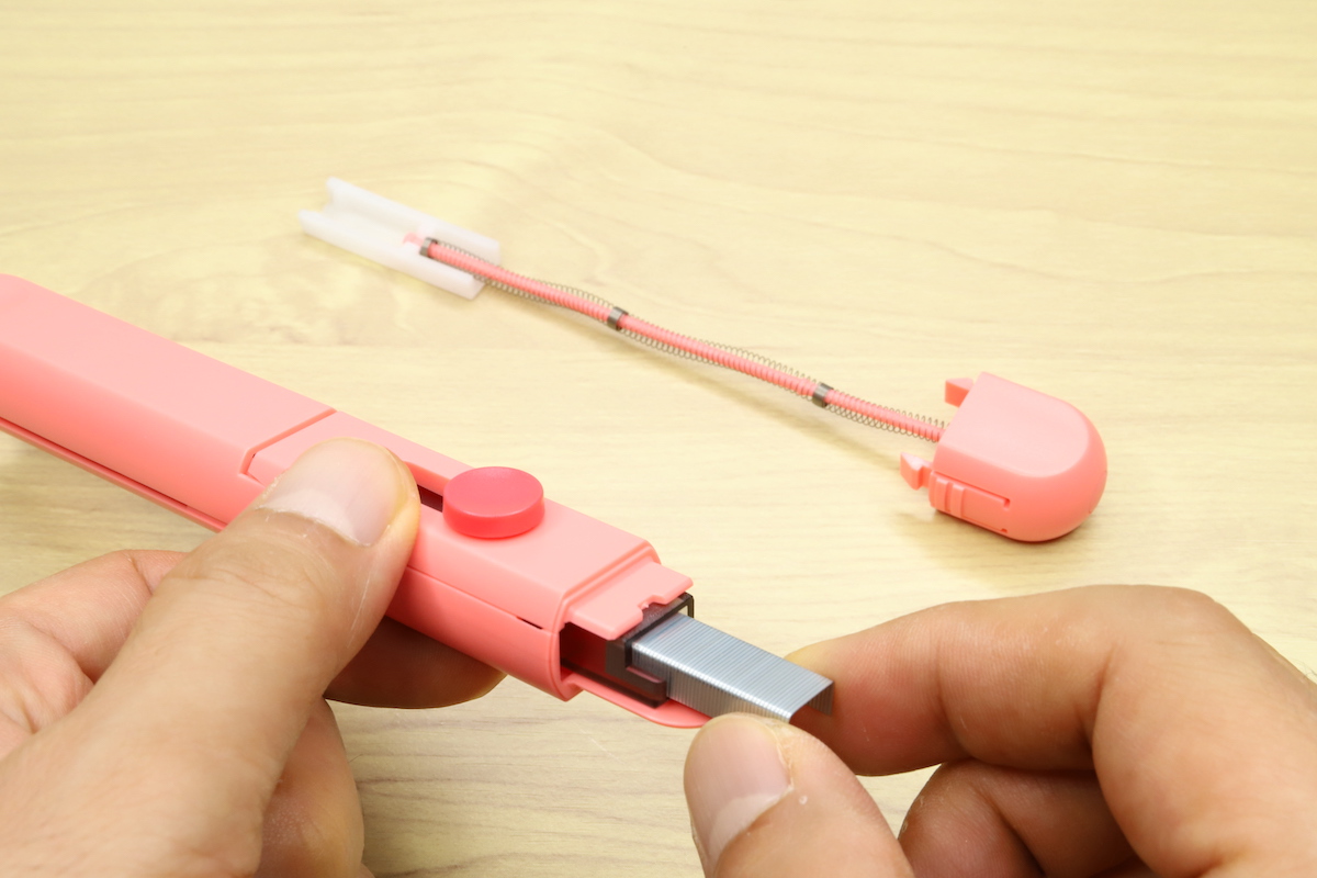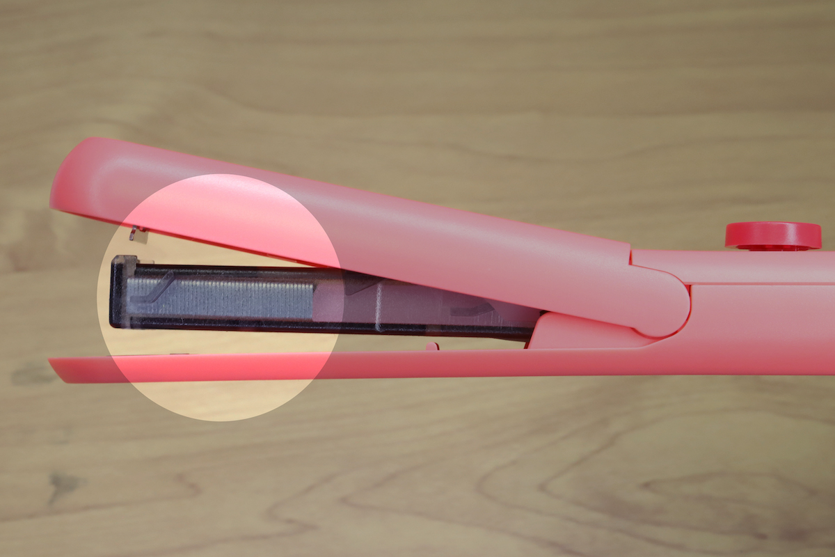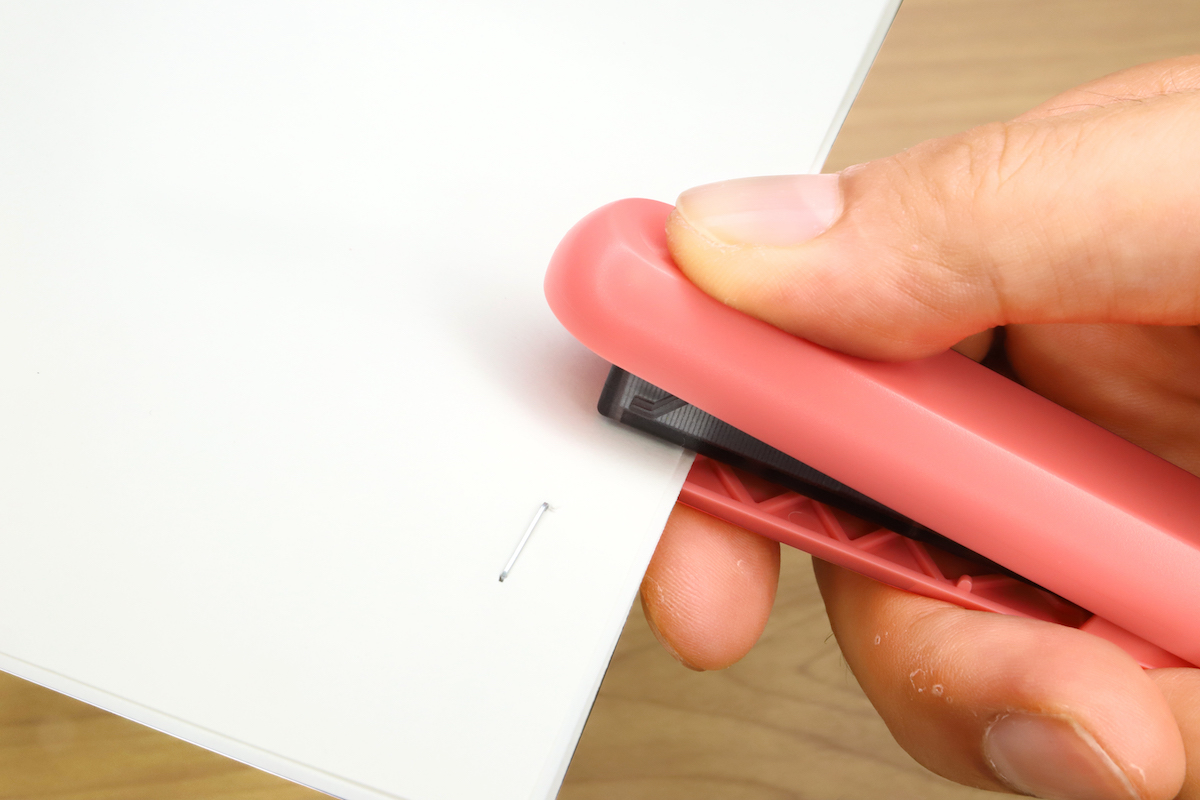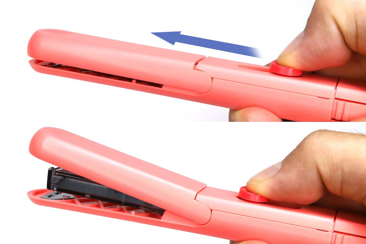 使用時は、丸いボタンをスライドさせると先端のカバーがガチャっと持ち上がり、中のマガジン(針を装填するボックス)がわずかにせり出す。これでホッチキスっぽい雰囲気に変形して、準備は完了だ。あとは通常どおり紙束を挟んでカバーを押し込むと、ガチャンと針で綴じることができる。