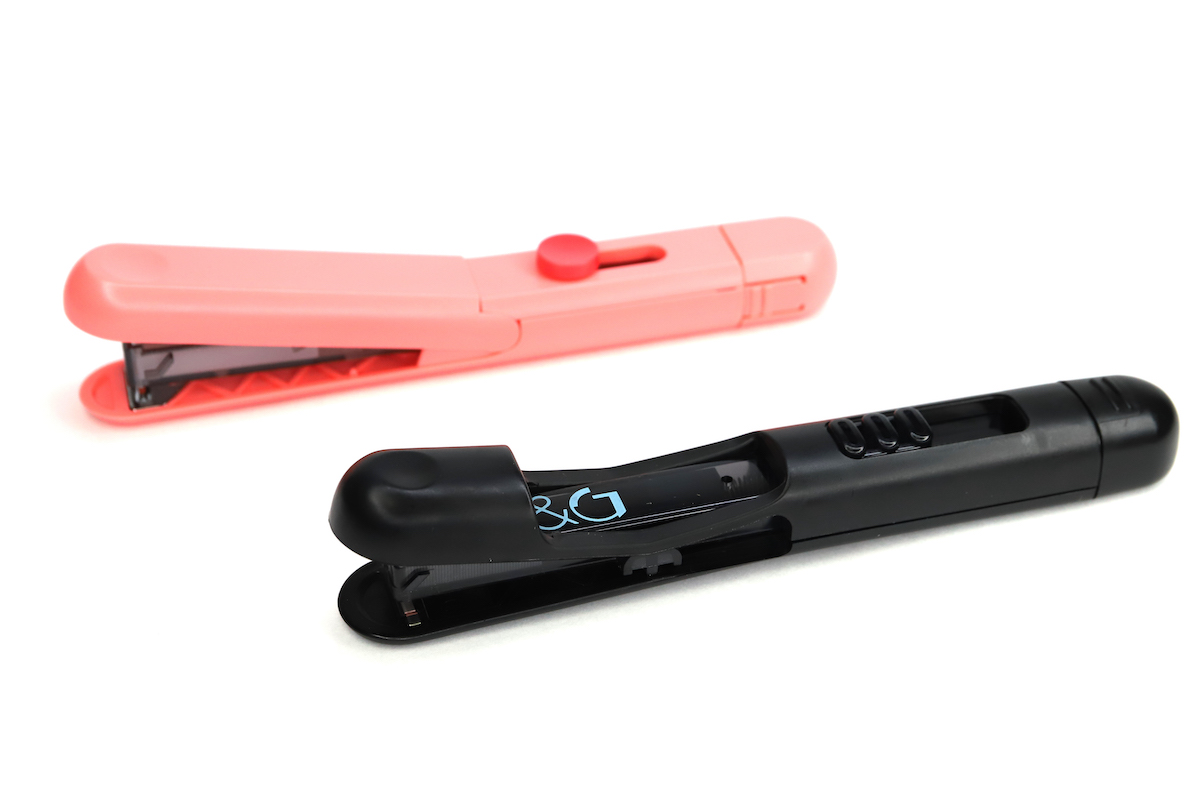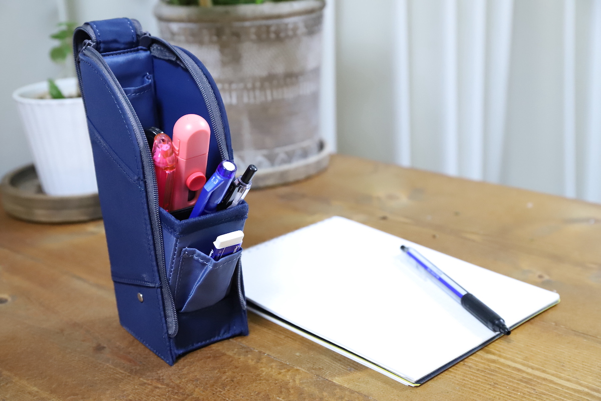 これまでも携帯しやすいミニホッチキスはいくつか発売されているが、自立型ペンケースに入れると、底に沈んでしまって取り出しにくいというデメリットがあった。しかしスティック型なら、自立型ペンケースとの相性は抜群だ。