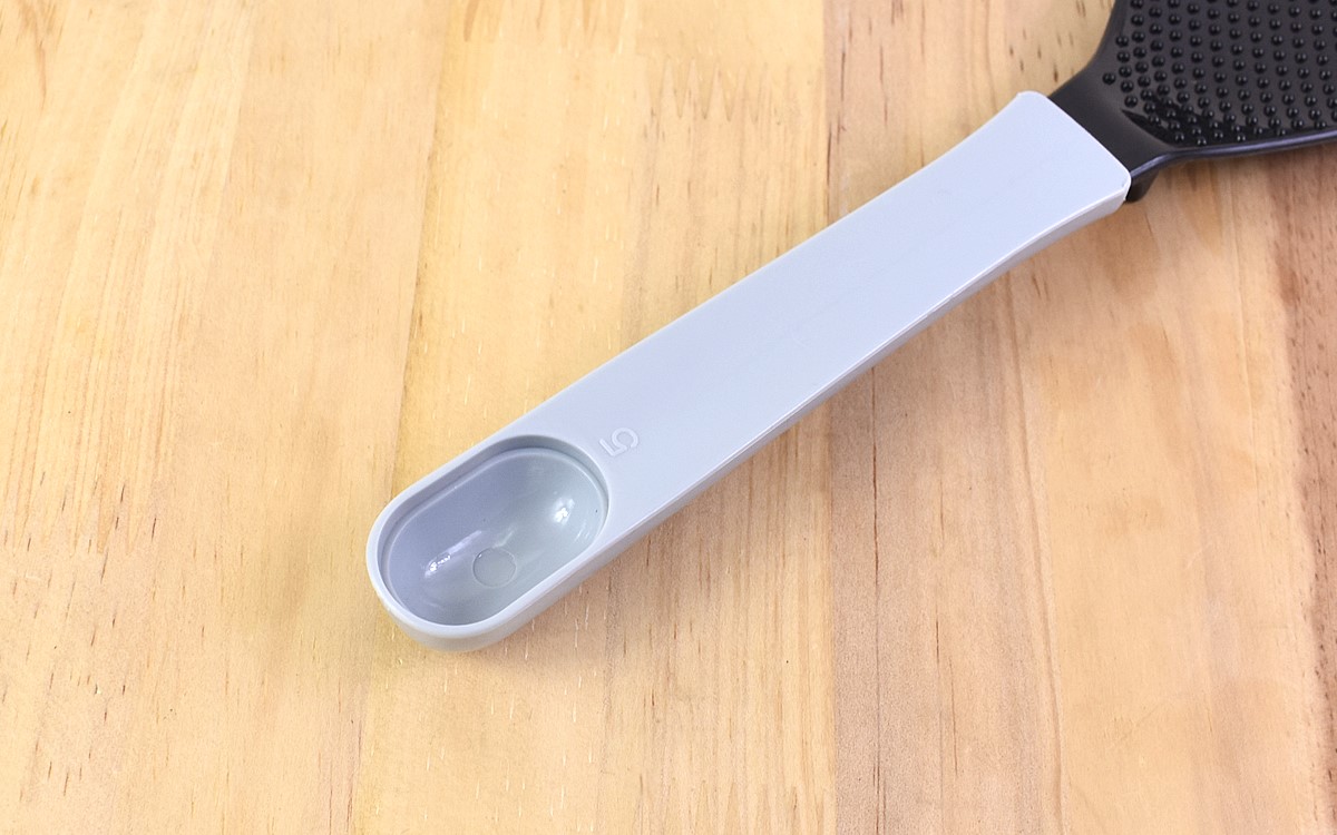 ハンドルの先端部は計量スプーンが付いていて、小さじ1(5cc)・小さじ1/2(2.5cc)として使えます。これで調理中に新たにスプーンを出す必要もなくなり、1つ洗い物が減りました。