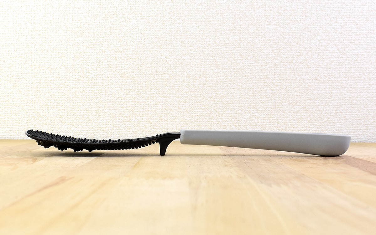 真ん中付近についているスタンドは、あると嬉しいポイント。調理中にさっと置くことができ、置いたときに先端部分が浮いていることで衛生的に保てます。