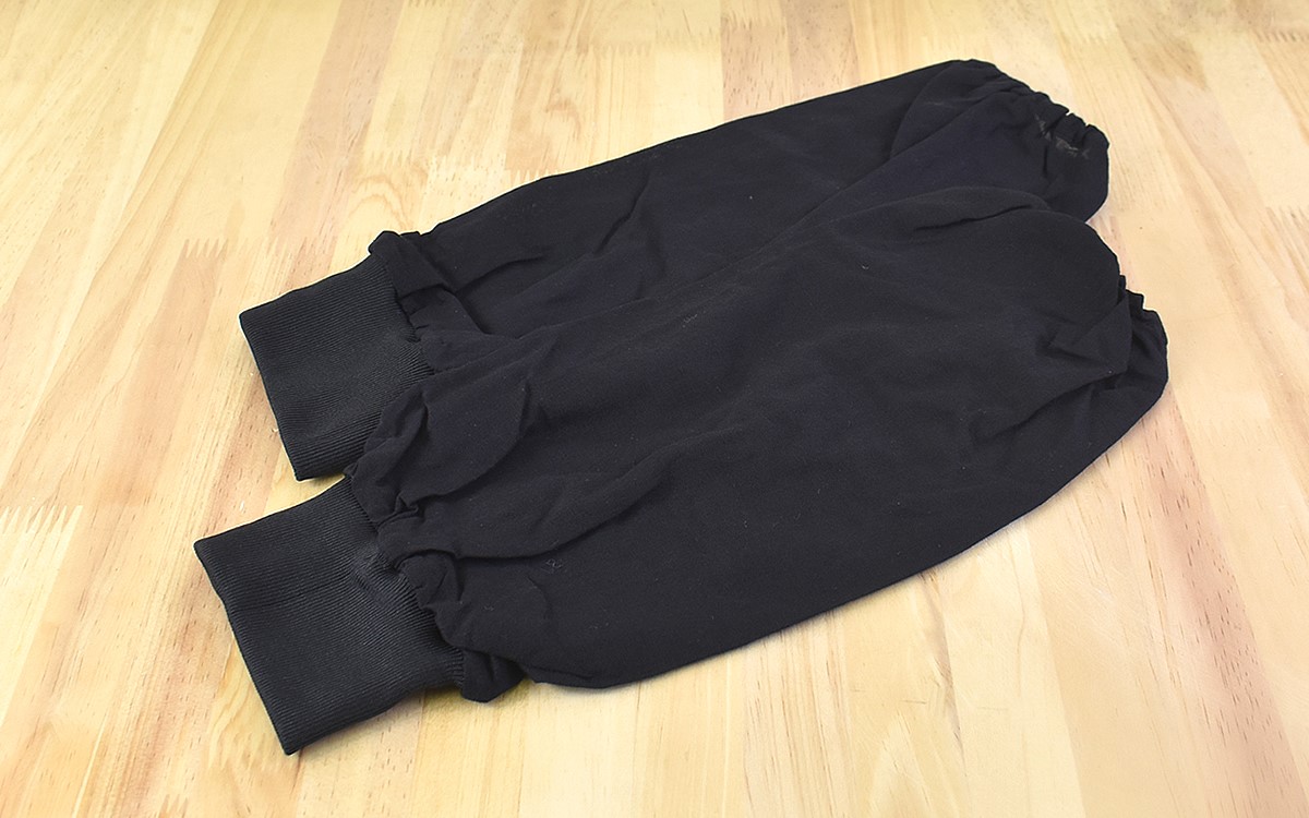 DIYや塗装作業はもちろん、庭木の剪定や草刈りなどでも活用している腕カバー。装着時のきつさもやや面倒ですが、長時間使うと疲れてしまうので圧迫感の少ないものを探していました。そんな時に興味をひかれたのが、「腕カバー ジャージ付」(175円/税込み)です。