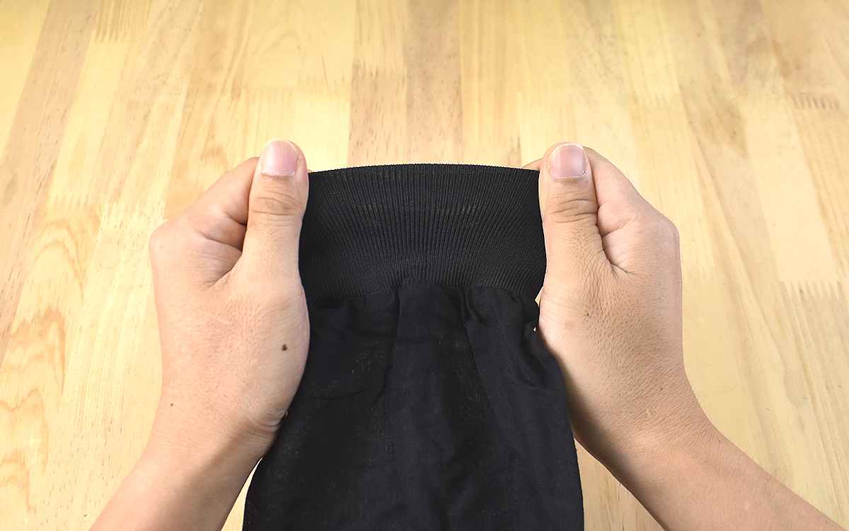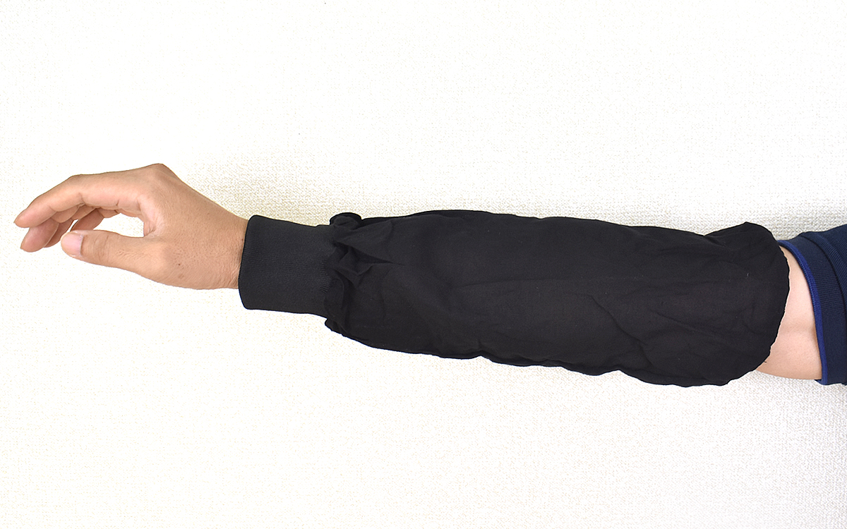 実際に腕に着けてみたところ、肘側はゴムの締めつけを若干感じるものの手首側は普段着るトレーナーと変わらない自然な着け心地。肘側の締めつけもきつくはなく、長時間つけていられそうです。腕カバーの全長は約36cmあるので、すっぽりと腕をカバーできますよ。