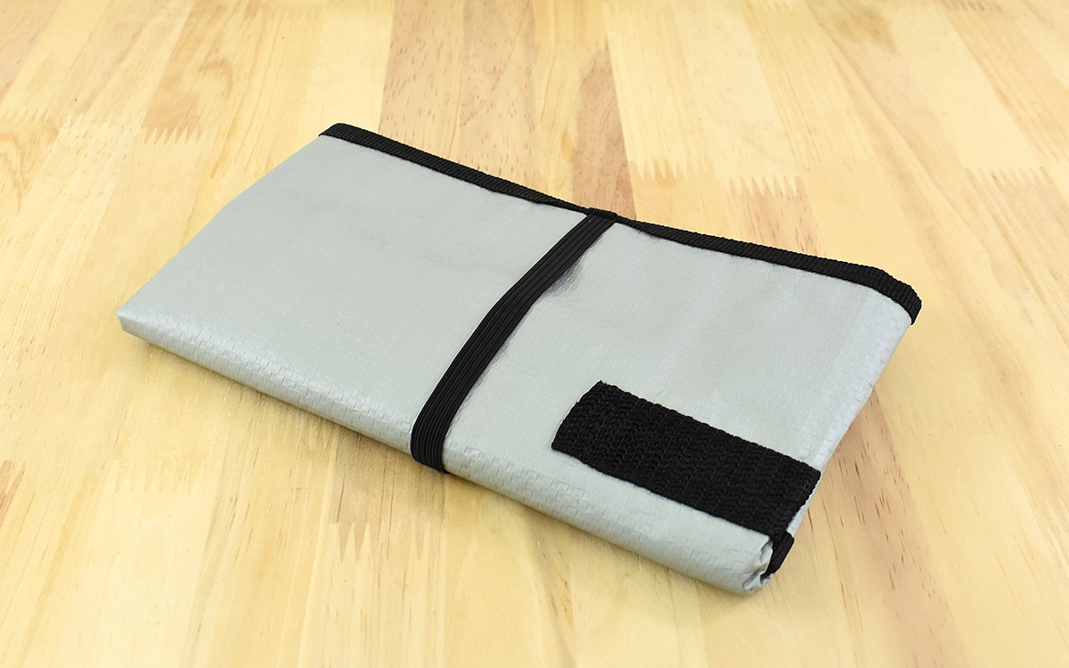 折りたたむと11.5(縦)×21cm(横)ほどになりますが、嬉しかったのはまとめゴムが付属だったところ。使わないときもコンパクトに収納できます。本体の素材も200円商品だけあってかなりしっかりとした作り。強めに引っ張ってみても裂け目などは入りませんでした。