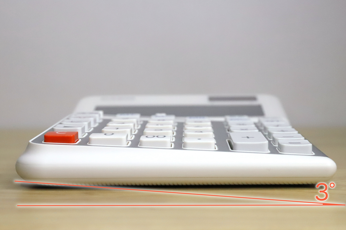 お分かりいただけただろうか? なんと電卓のキーが左から右に向かって階段を下るように傾いているのである。