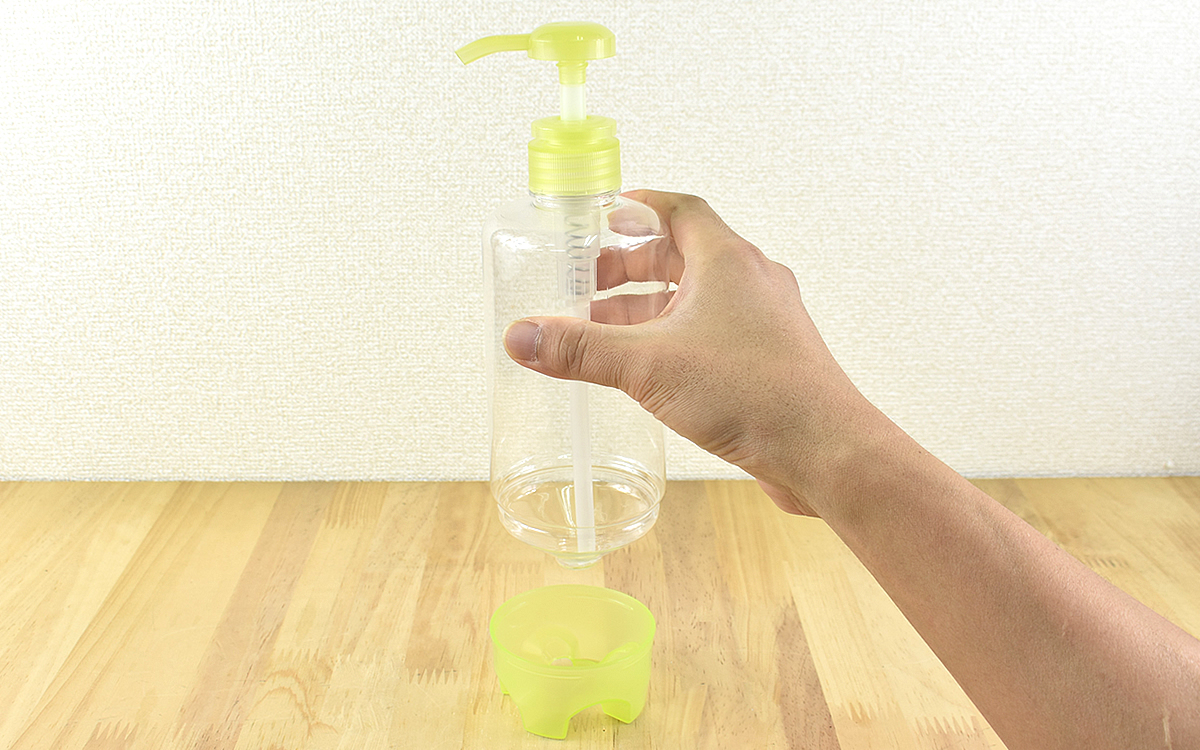大きさは約7.9(幅)×7.9(長さ)×19.8cm(高さ)で容量は500mlまで入ります。見た目はよくあるポンプボトルですよね。本体は実は3つに分かれていて、足の部分も取り外しができました。