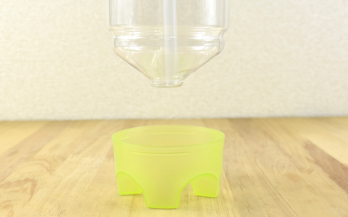 注目したいのは足から外したボトルの底の部分。すり鉢状にすぼまっているため、少なくなった液が中心に集まるような仕組みになっていました。吸い上げ口も中心のくぼみにあるので、最後まで液を吸い上げることができるというわけです。