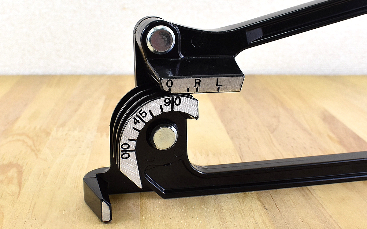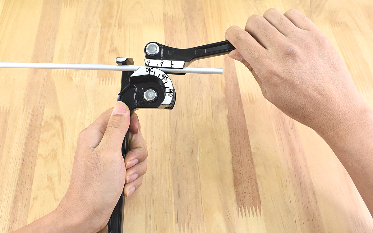チューブベンダーの側面には、00・45・90と角度を表す数字が表記されています。細かい目盛りはないものの、よく使う角度が示されている点は好印象。それでは実際にチューブベンダーを使ってみましょう。本体にはそれぞれ6・8・10mmの管に対応した溝があり、曲げたい管がしっかりフィット。さらに押さえを使って管をがっちりホールドできます。あとはホイールのカーブと関節の動きに任せてハンドルを下げるだけで、硬い管をすんなりと曲げることができました。普段不器用な人でも思った通りの角度に管を曲げられ、ノーストレスで使えるのは助かりますね。