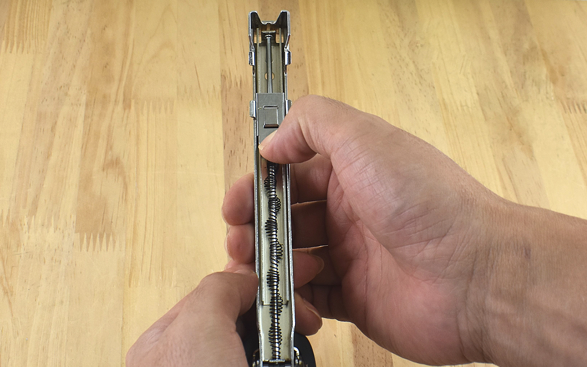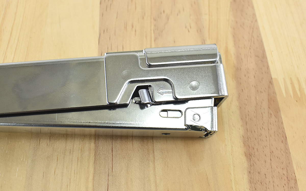 ステープルと呼ばれる針を入れる時は、先端の近くにある突起状のレバーを矢印の方向に下げて格納スペースを出します。格納スペースのレバーを下げてステープルを入れ、再び本体側のレバーを下げながら元に戻せばセット完了。文房具のステープラーとよく似ている構造なので、初めてでも抵抗なくセットできました。