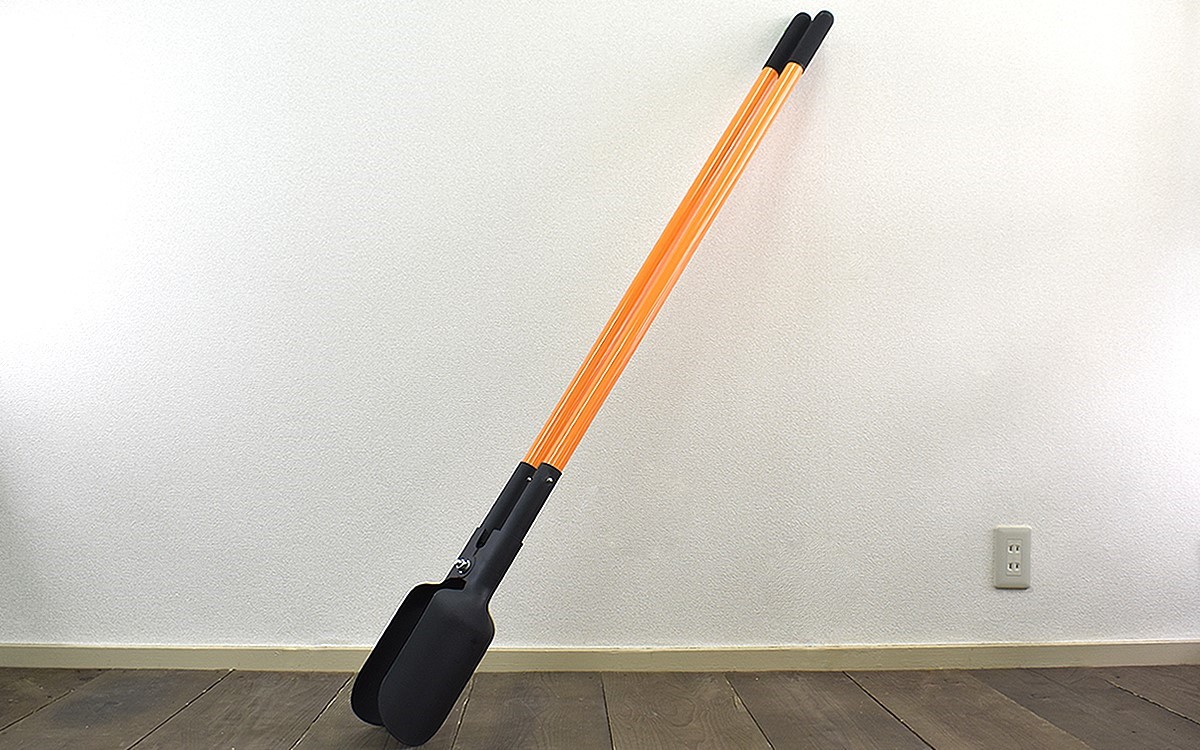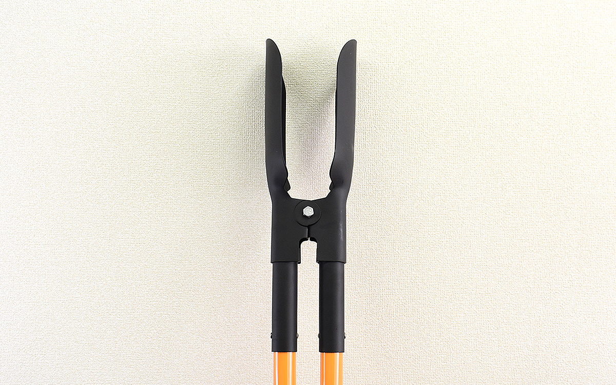 全長は約1500mmのためかなり大きく見えますが、商品そのものはスリムなので保管時にも邪魔になりません。構造自体はシンプルで、長い柄の先にカニのはさみのような鉄製ショベルがついています。柄を閉じた状態ではショベル同士の先端が開き、反対に柄を開くと先端が閉じるのが特徴。関節部分はボルトで締められていました。柄の開閉には少し力を使う程度なので、男女ともに扱いやすいでしょう。