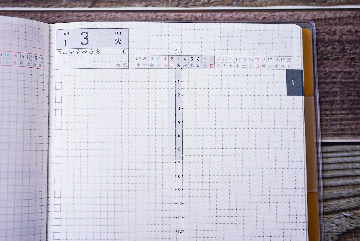 約3mmの方眼罫になっており、30分刻みで細かく予定や行動を記入できます。仕事中に集中力がないなと感じた時には30分ごとに行動を変えて手帳に書き込み、気分転換のきっかけにしています。