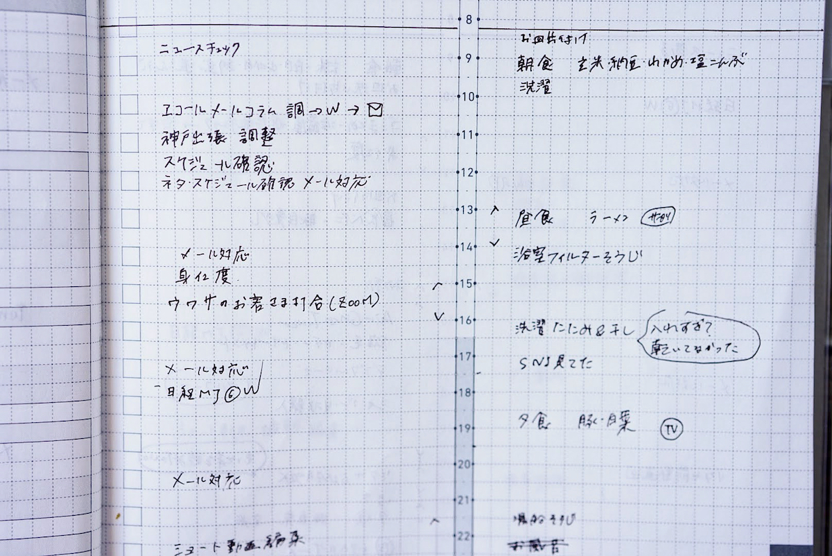 24時間軸を境に左右にスペースが分かれている「ジブン手帳 DAYs mini」。私は左側に仕事の内容、右側にプライベートの内容を書いています。