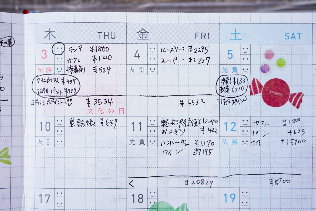 よく見るとマンスリーページも約3mmの方眼罫になっていて、細かく綺麗に予定を記入できます。私はこのページをスケジュール管理ではなく買い物記録一覧にして無駄遣いを防いでいます。