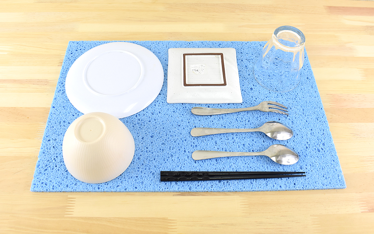 商品の大きさは約480(横)×310(縦)×7mm(厚み)で、食器の水拭きにもテーブル拭きにも使える丁度良いサイズ感。試しに洗った食器を水切りのために置いてみました。マットの下に水が染みることもなく、その吸水性能に驚かされます。