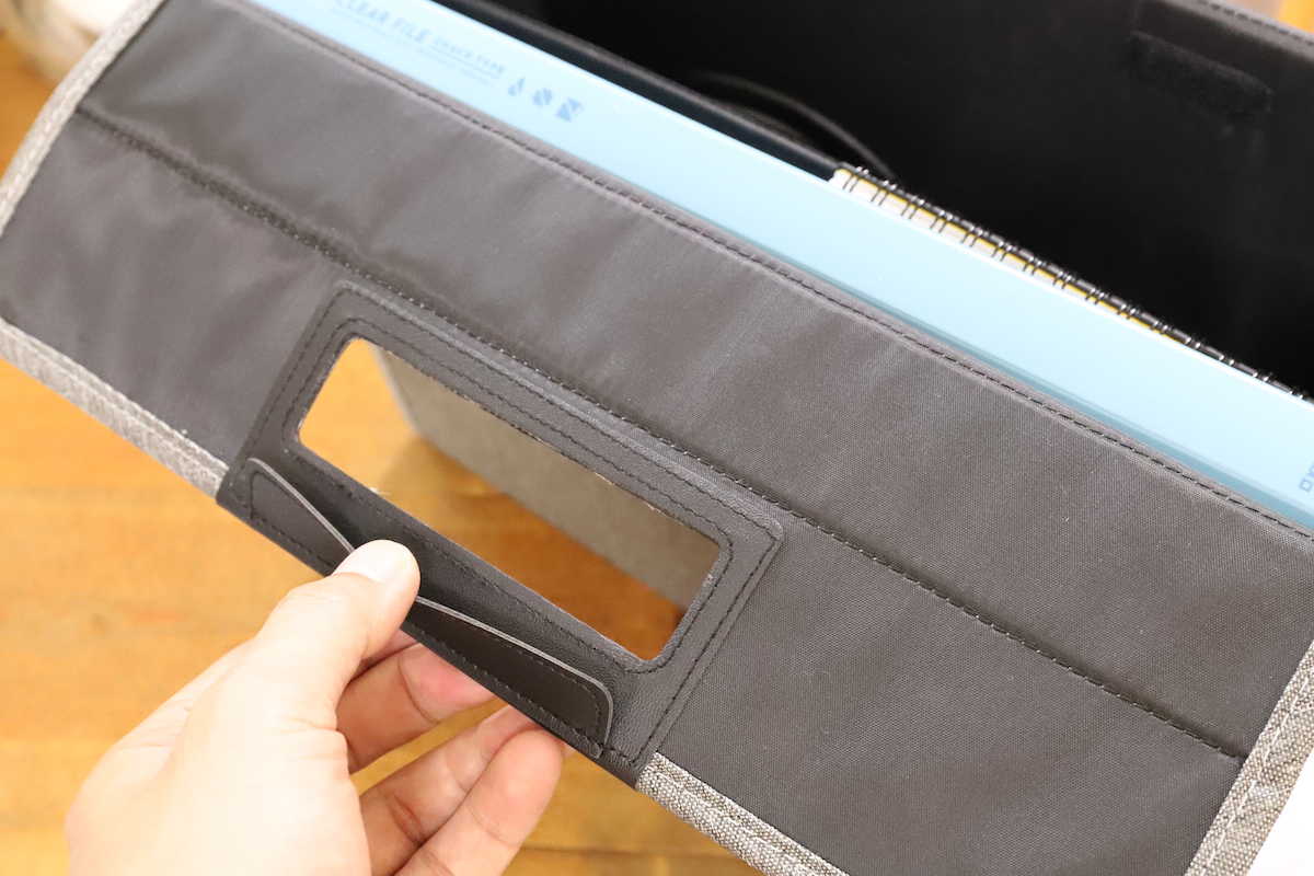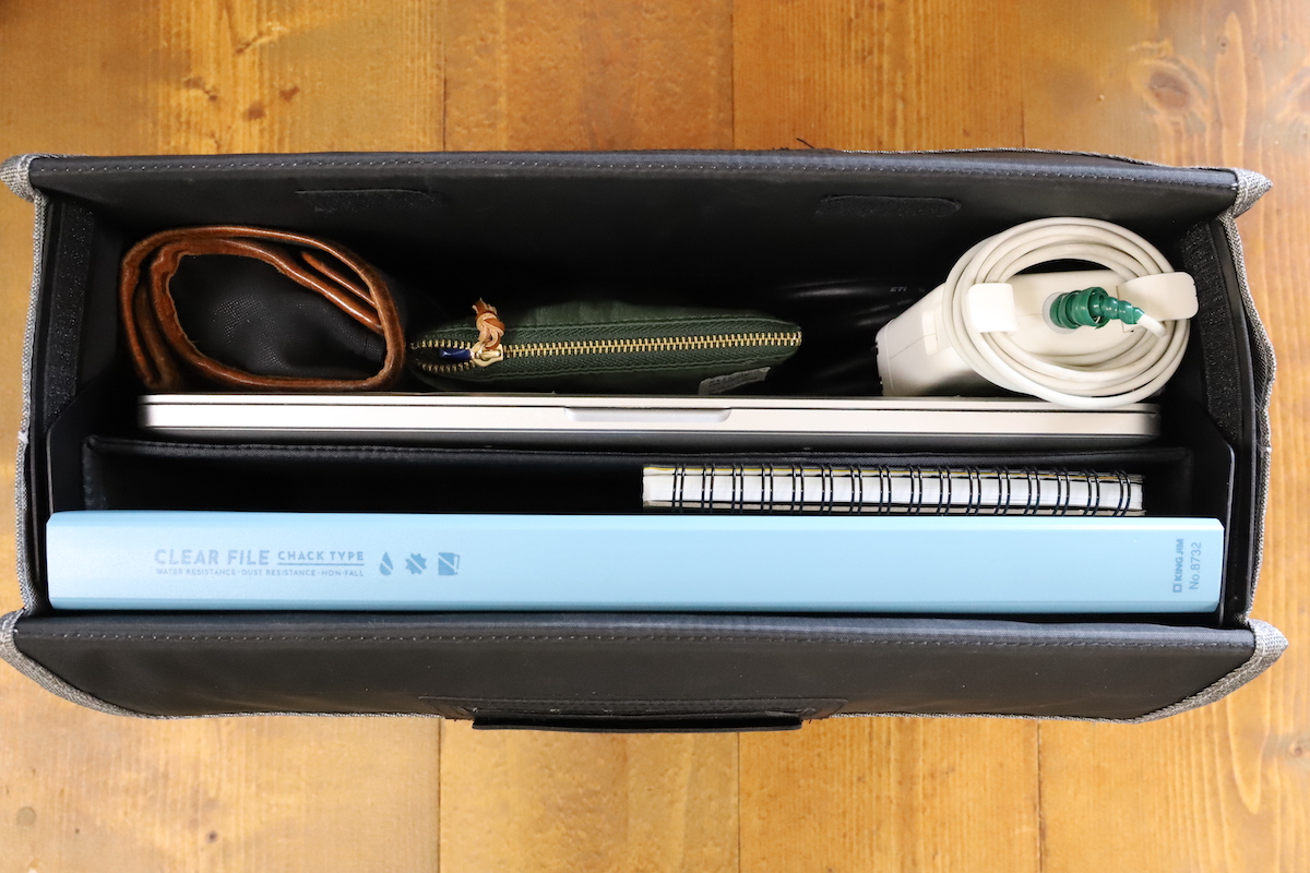 フラットに四角い形状は収納スペースに無駄がなく、サイズ的にも、オフィスワークに使う道具ならだいたいすっぽり収まる。