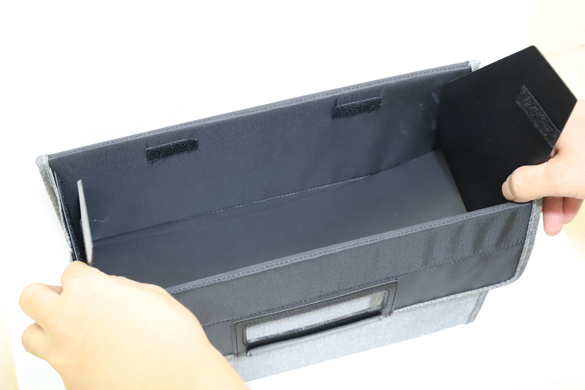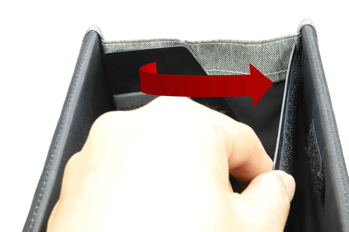 PCスタンドとして使用する際は、まずバッグ内部の側面口に面ファスナーで貼り付けられているフレームをバリッと剥がし、前面口側に貼り直す(左右両方)。