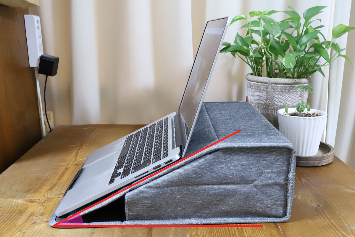 あとはバッグを机に置き、上からノートPCを乗せると……ナナメに角度が付いたPCスタンドに変形完了だ。