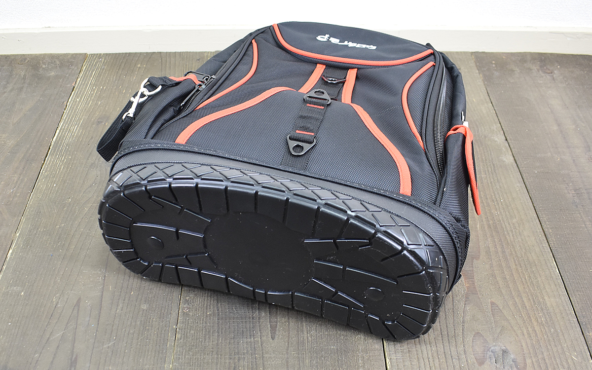 バックパックの底面はポリエチレン製となっており、例えるならバケツの底の部分を5cmほど付けた感じです。自立するので屋外でも置きやすく、布でサッと拭くだけで汚れが落ちるのもGOOD!