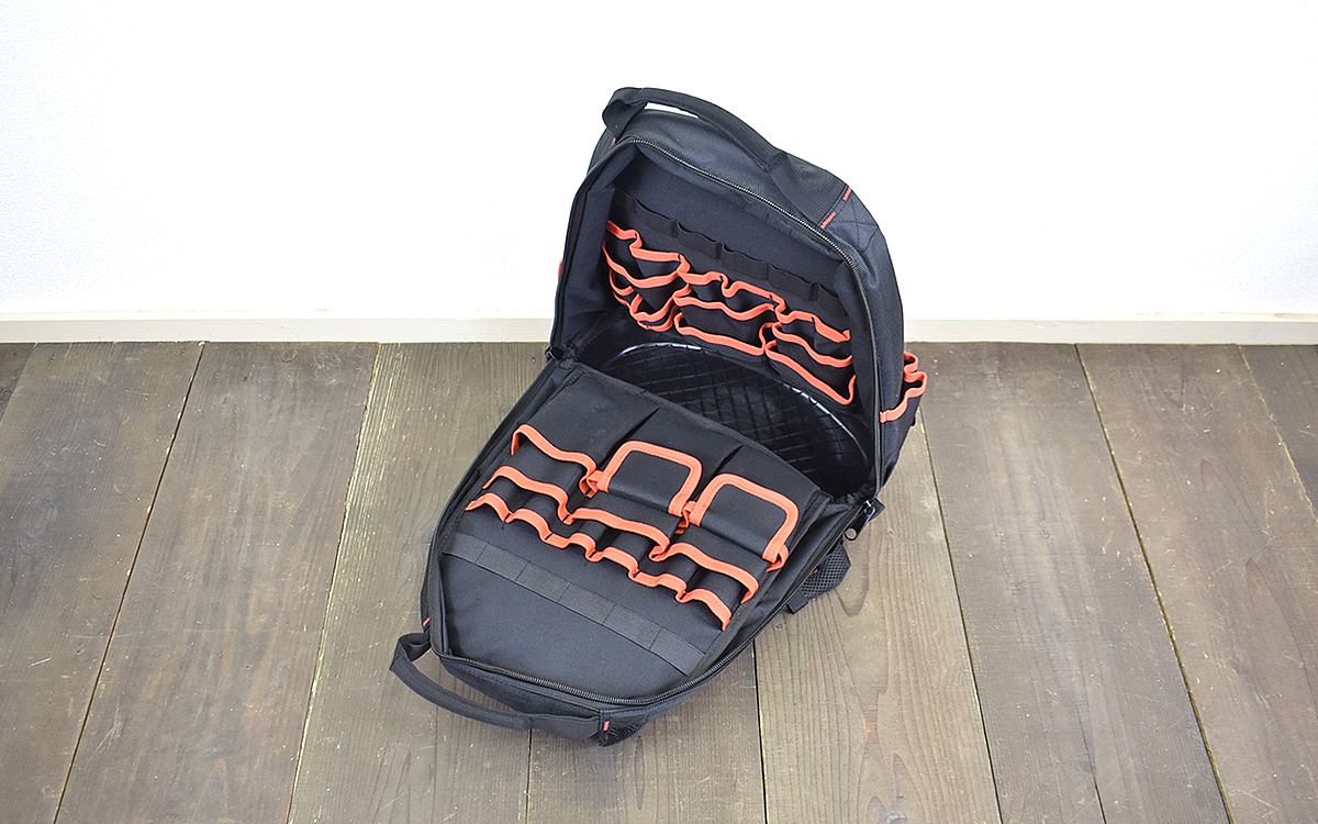 どんな工具でもだいたい入ってしまうので、持ち運びに限らず収納用で使用してもいいかもしれません。「リピート買いしました!」という意見があるのもうなずける「工具用 バックパック」、オススメです!