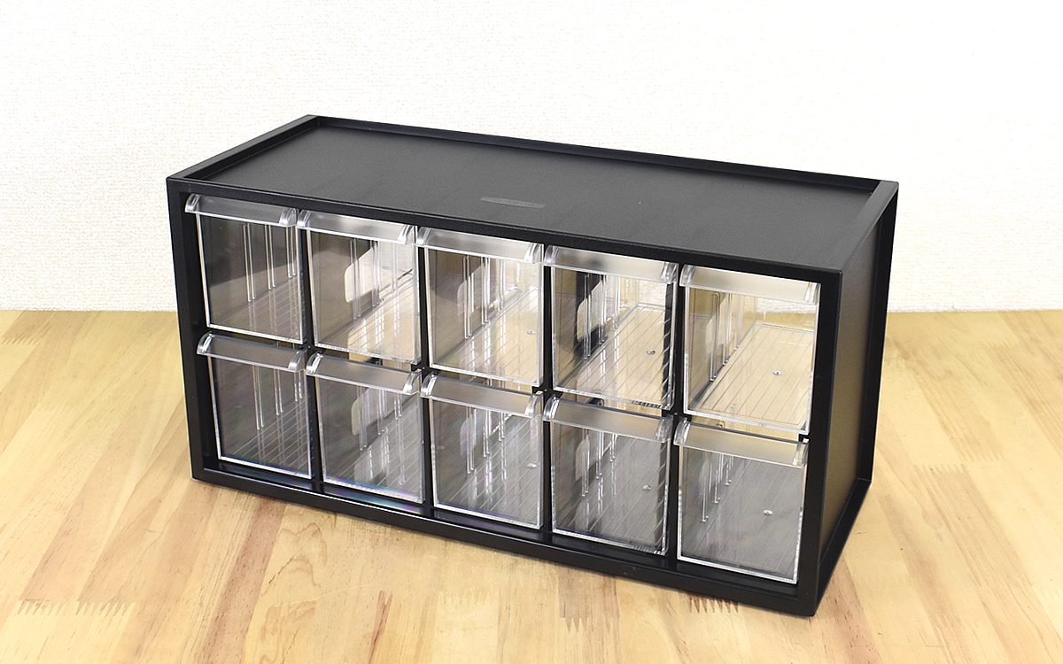 家での時間を充実させるため、ちょっとした収納家具を作ったり壁に棚を取り付けたりとDIYを楽しんでいるのですが、DIYにハマればハマるほど増えるのが細々とした工具やパーツ類。手頃なパーツ収納BOXも使ってみましたが、工具の大きさによっては上手く収納できないものも。なんとかスッキリと収納する術はないものかと思っている時に見つけたのが、「パーツキャビネット 引出 小深×10個」(2849円/税込)です。