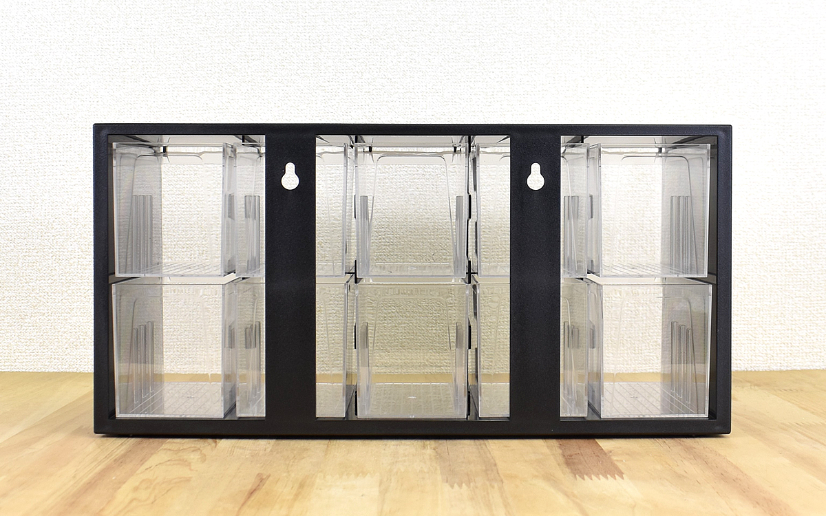 キャビネット全体は37.8(間口)×15.5(奥行)×19cm(高さ)と、作業台に置くのに丁度いい大きさ。自宅でちょっとDIYをしている人にぴったりです。作業台のスペースを確保したい場合には、背面の穴に引っ掛けて壁掛けで使用するのもOK。置いて使用するときも底に4か所ついている足のおかげで据わりがよく、ガタガタしにくいのが嬉しいですね。