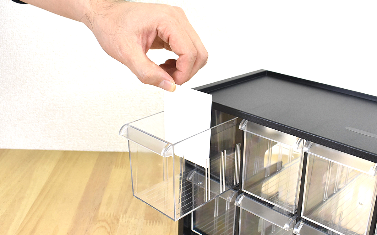 仕切り板が10枚付属しているので、各引き出しに1つずつ仕切りをつけられます。取り付け方は引き出し内の溝に合わせて板を差し込むだけ。溝は各引き出しに3か所ついているため、収納するものに合わせて好きな場所で仕切れます。