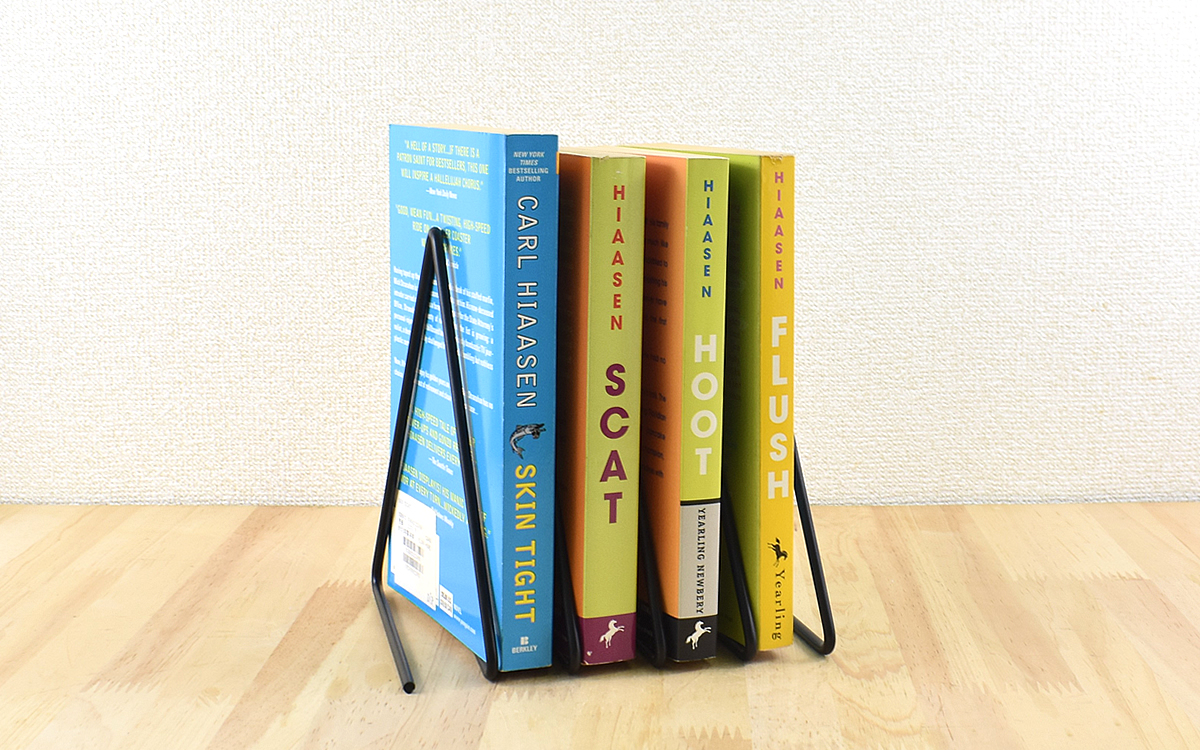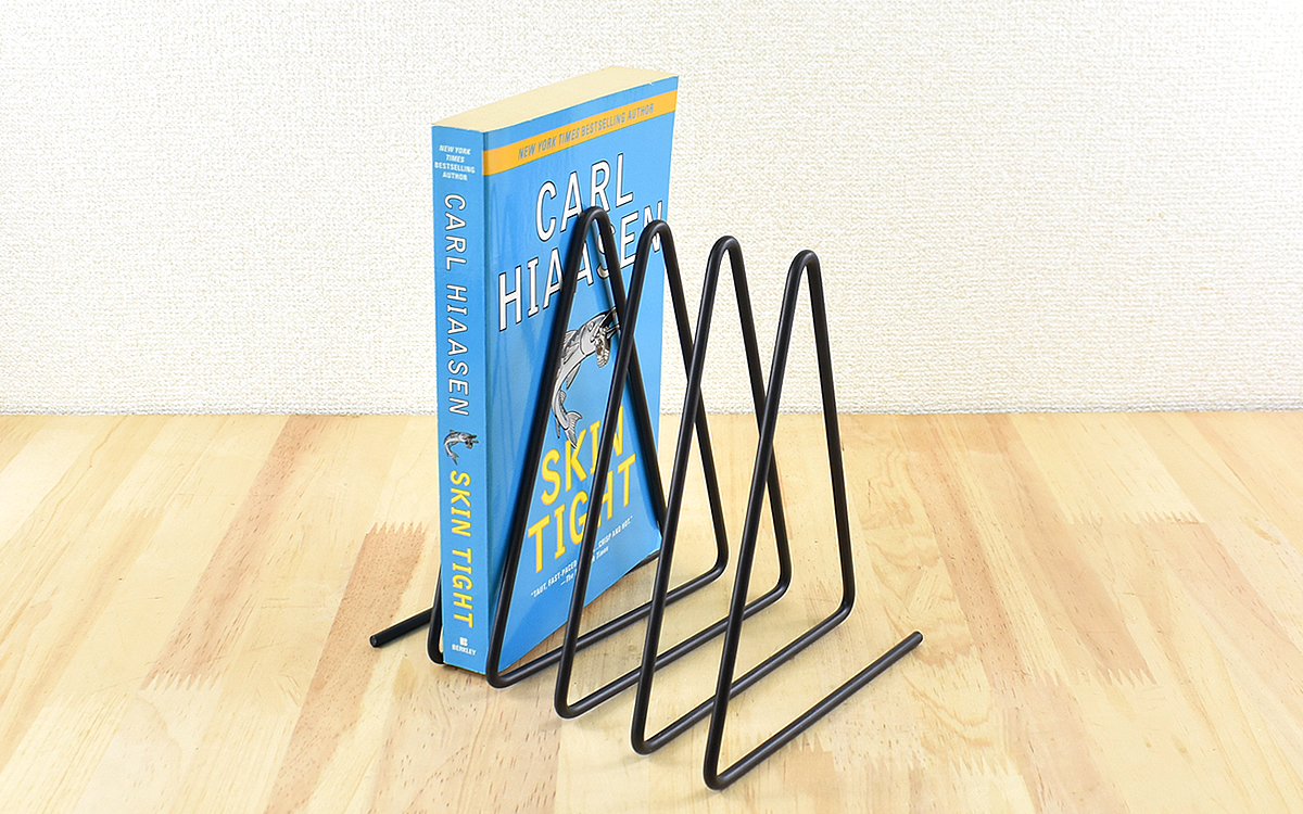 1本の鉄材が連なった形状ですので、本は背表紙に対して斜めに直立する形になります。付属品は一切なくデザインも作りも至ってシンプル。カラーはブラックのみの展開ですが、このデザインなら黒が一番しっくりきそう。