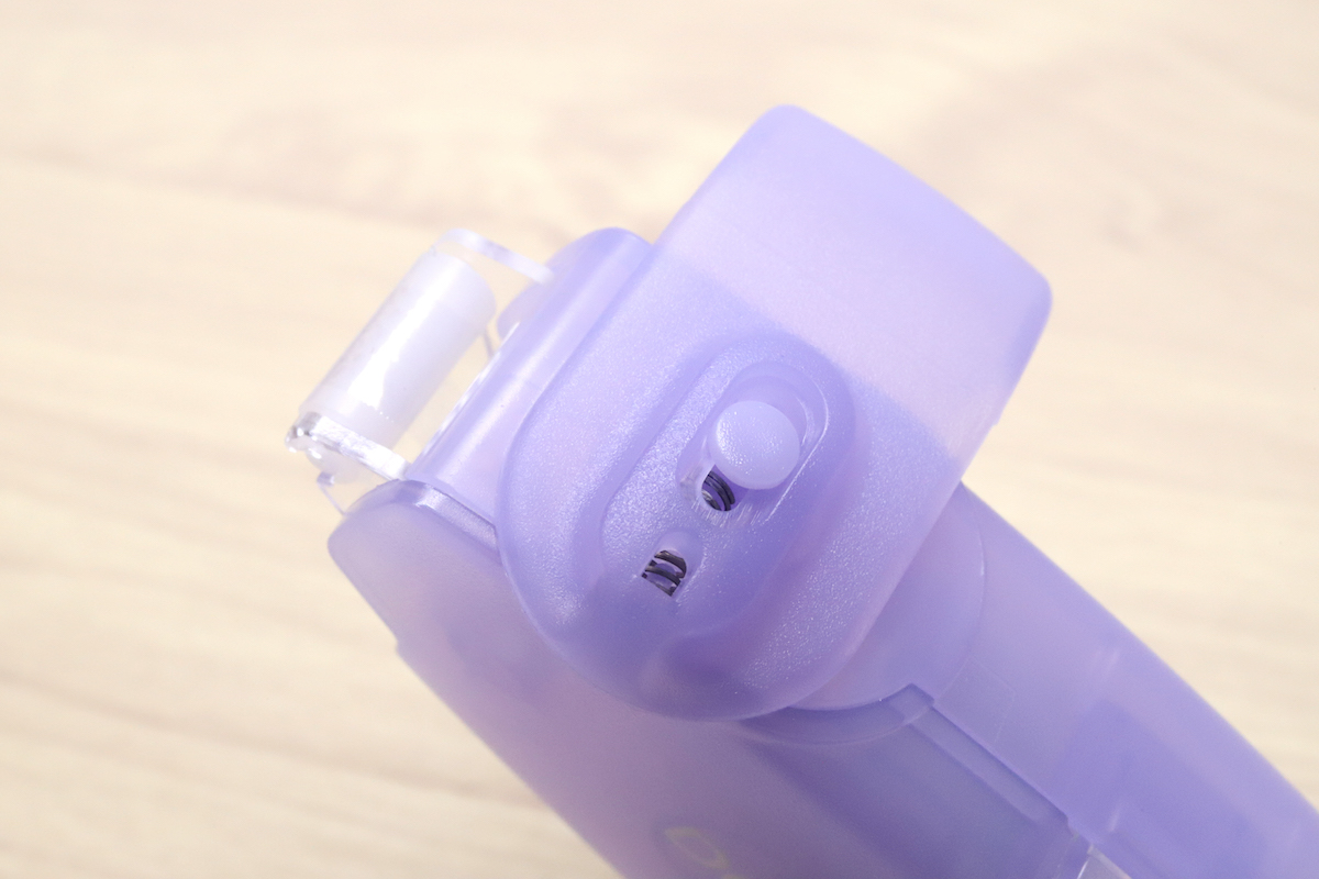 「フリック」という名前の元になっているのが、フルカバータイプのフリックキャップ。まずキャップ基部に親指を当ててグッと前に押し進める。そのまま親指を横方向(左右どちらでもOK)に軽くずらすと、バネの力でキャップが勢いよくスパッと本体横に回り込む。これがキャップの開いた状態となる。